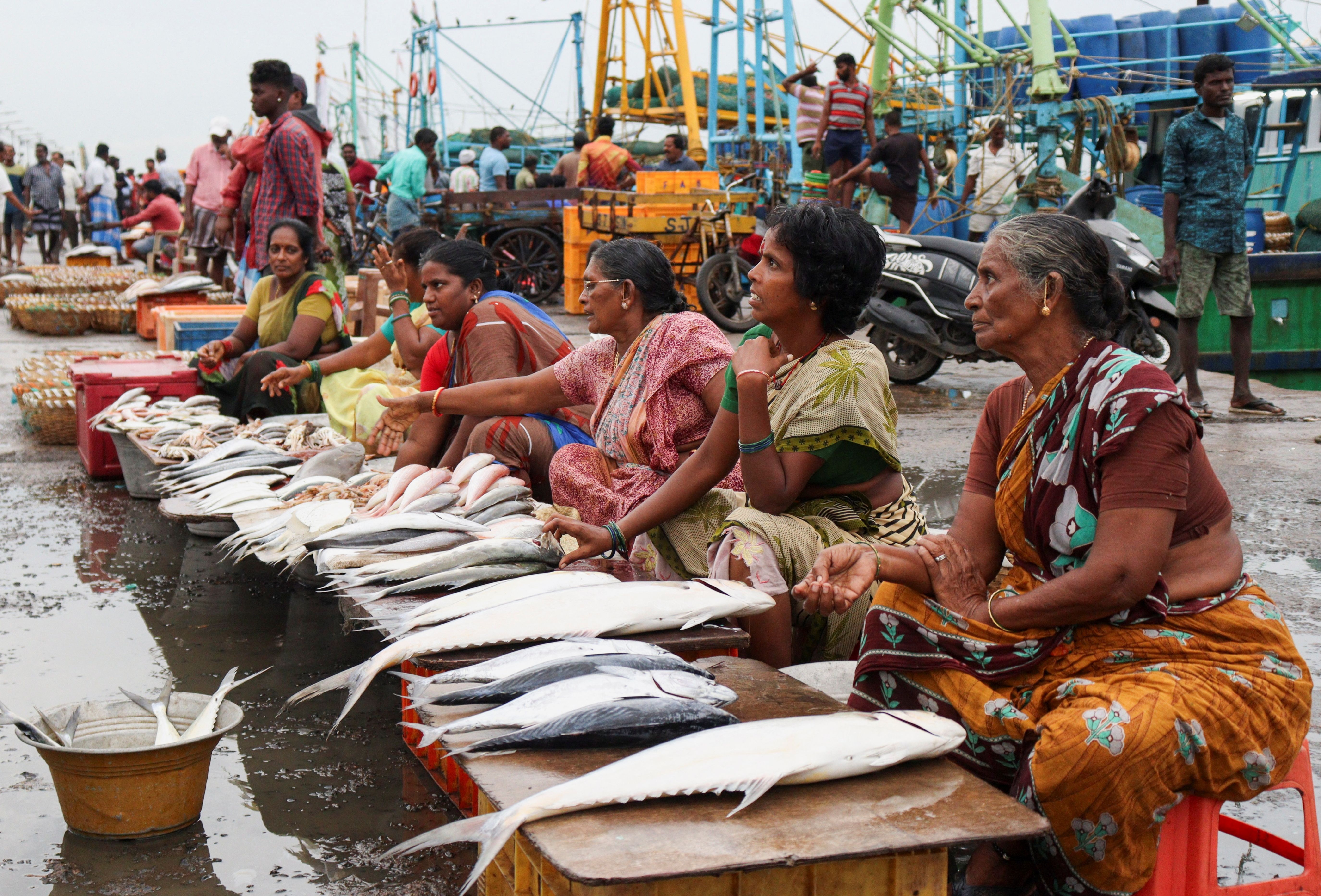 Women wait for customers at the fish harbour in Kasimedu Fish market, Chennai, India, on June 26, 2024. (Photo by Riya Mariyam R./Reuters)