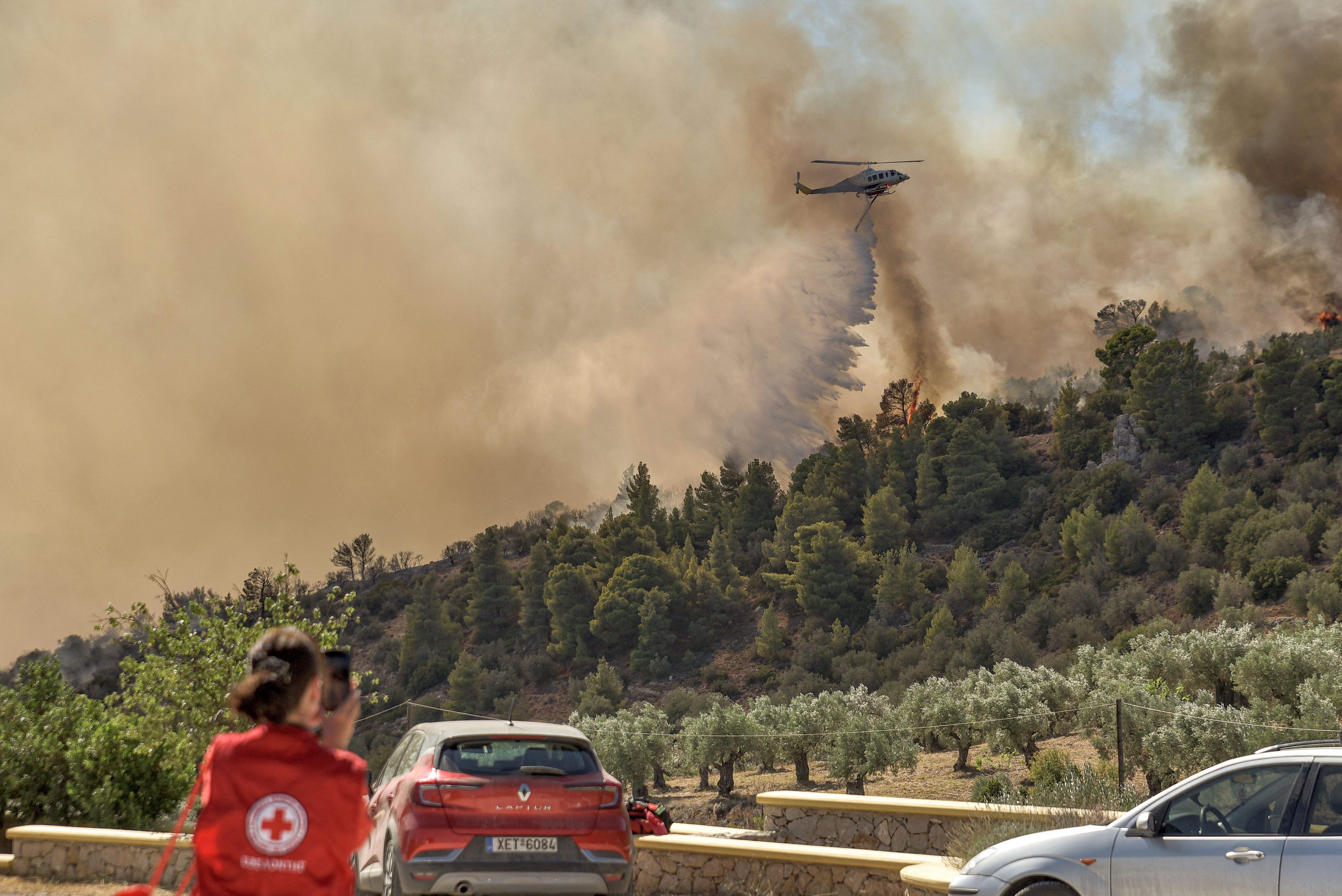 A fire-fighting helicopter drops water over a wild fire near Prodromos, 100km northeast from Athens, on August 21, 2023. (Photo by Spyros Bakalis/AFP Photo)