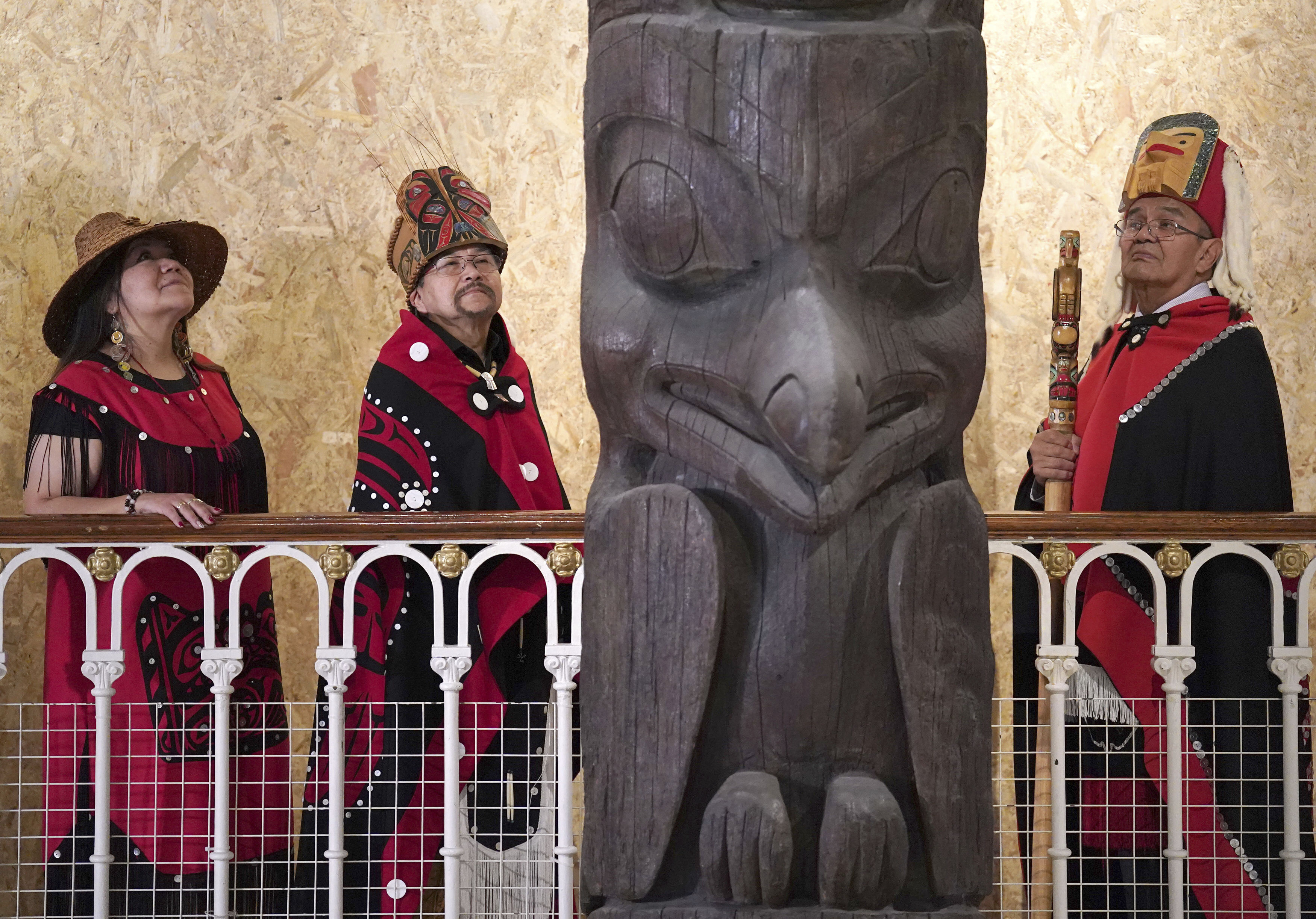 Earl Stephens, who has the Nisga'a cultural name Chief Ni'is Joohl, centre left, with Pamela Brown, left and another member of the delegation from the Nisga'a nation pose beside the 11-metre tall memorial pole, during a visit to the National Museum of Scotland, ahead of its return to what is now British Columbia, in Edinburgh, Monday, August 28, 2023. Members of a Canadian First Nation held a spiritual ceremony on Monday at a Scottish museum to begin the homeward journey of a totem pole stolen almost a century ago. (Photo by Andrew Milligan/PA Wire via AP Photo)