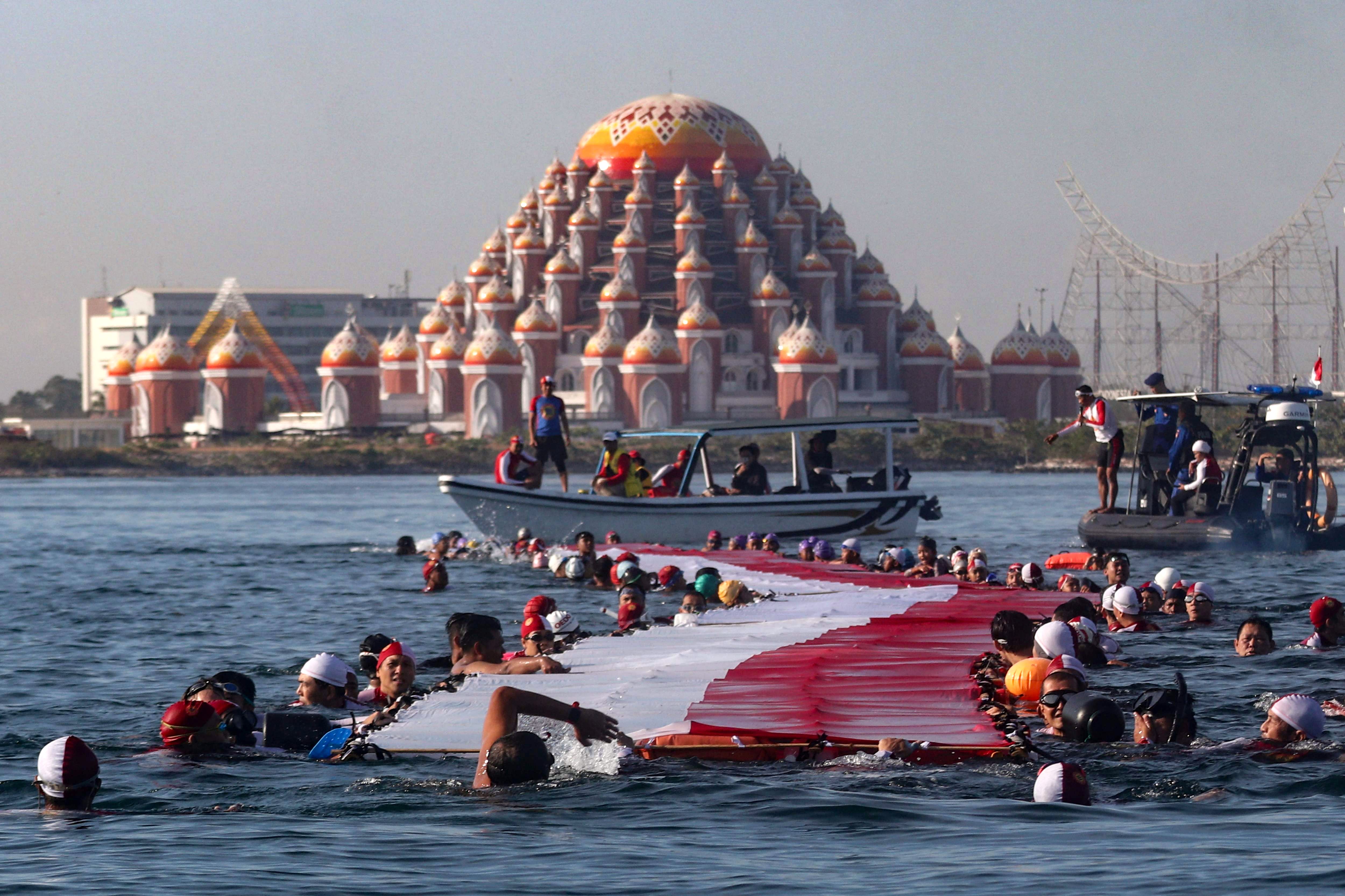 145 swimmers take part in an effort to stretch a 78-metre-long national flag in the sea ahead of Indonesia's 78th Independence Day in Makassar, South Sulawesi, on August 12, 2023. (Photo by Muchtamir Zaide/AFP Photo)