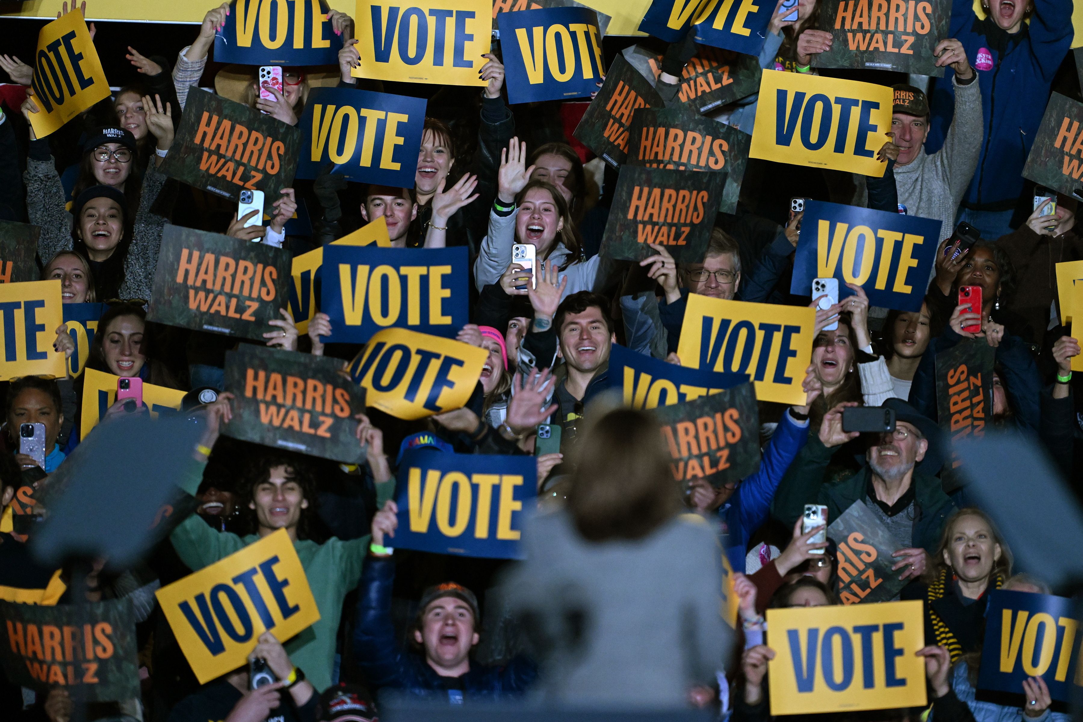 US Vice President and Democratic presidential nominee Kamala Harris thanks the crowd behind the stage at her campaign rally at Burns Park in Ann Arbor, Michigan, USA, 28 October 2024. Harris is running against former US president and Republican presidential nominee Donald Trump and the United States will hold its election on 05 November 2024. (Photo by Lon Horwedel/EPA/EFE)