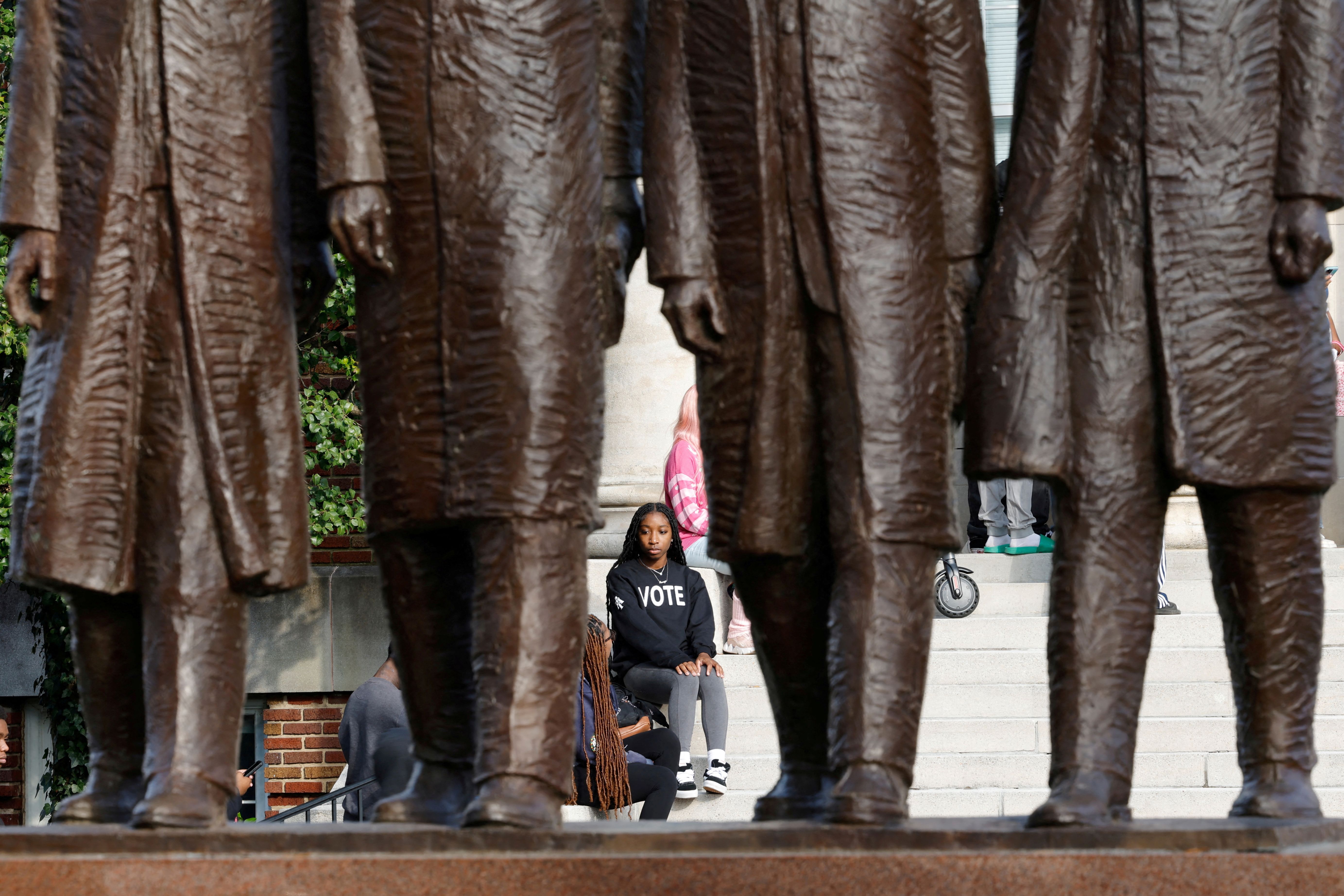 A student at North Carolina A&T State University, the state’s largest Historically Black College and University (HBCU), is framed by a statue of the Greensboro Four, students who in 1960 staged one of the first sit-ins at a segregated restaurant in the United States, as she waits in line to cast her ballot at an early voting site on campus, in Greensboro, North Carolina on October 28, 2024. (Photo by Jonathan Drake/Reuters)