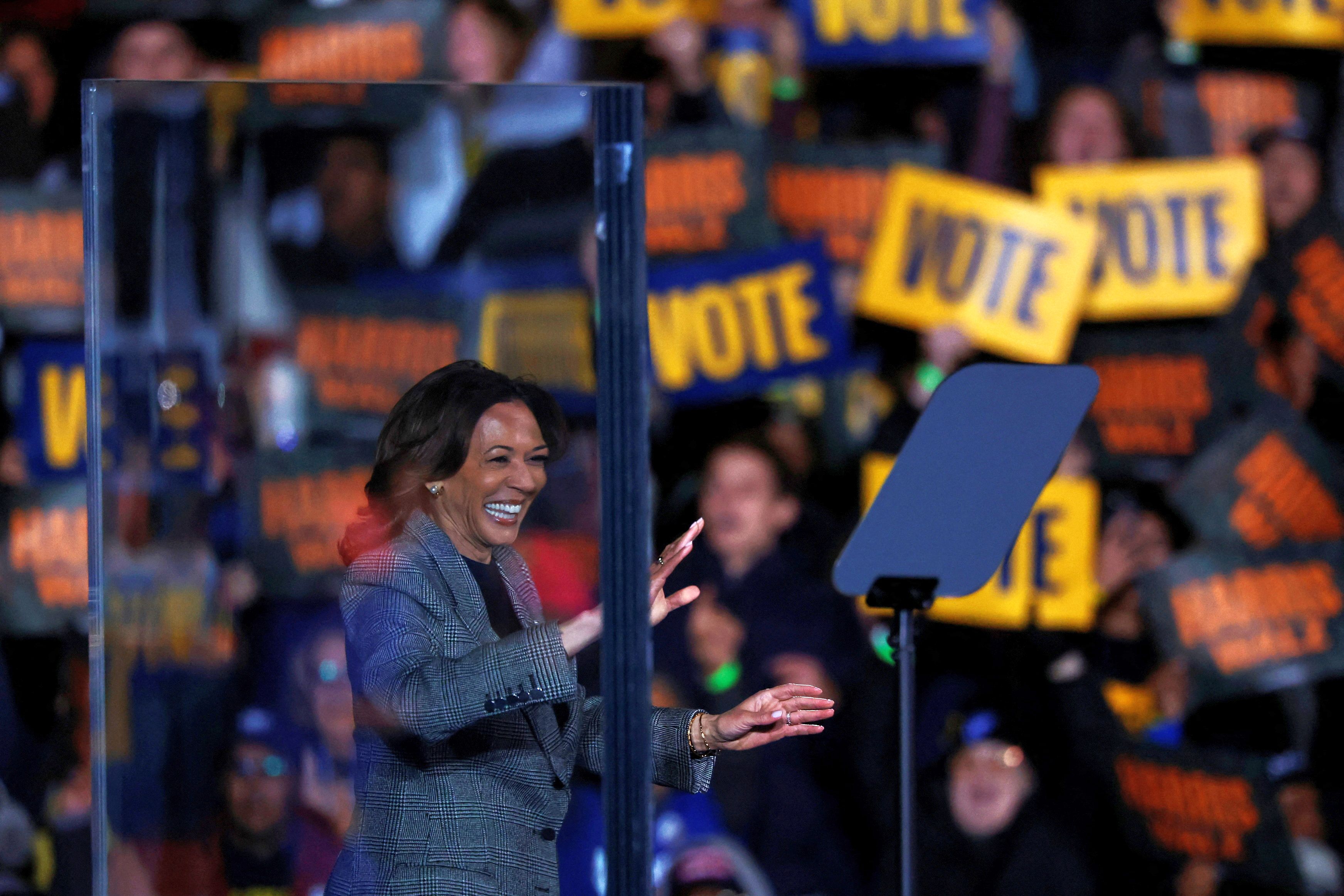 Democratic presidential nominee U.S. Vice President Kamala Harris applauds from behind a safety glass during a campaign rally and concert in Ann Arbor, Michigan, U.S. October 28, 2024. (Photo by Shannon Stapleton/Reuters)