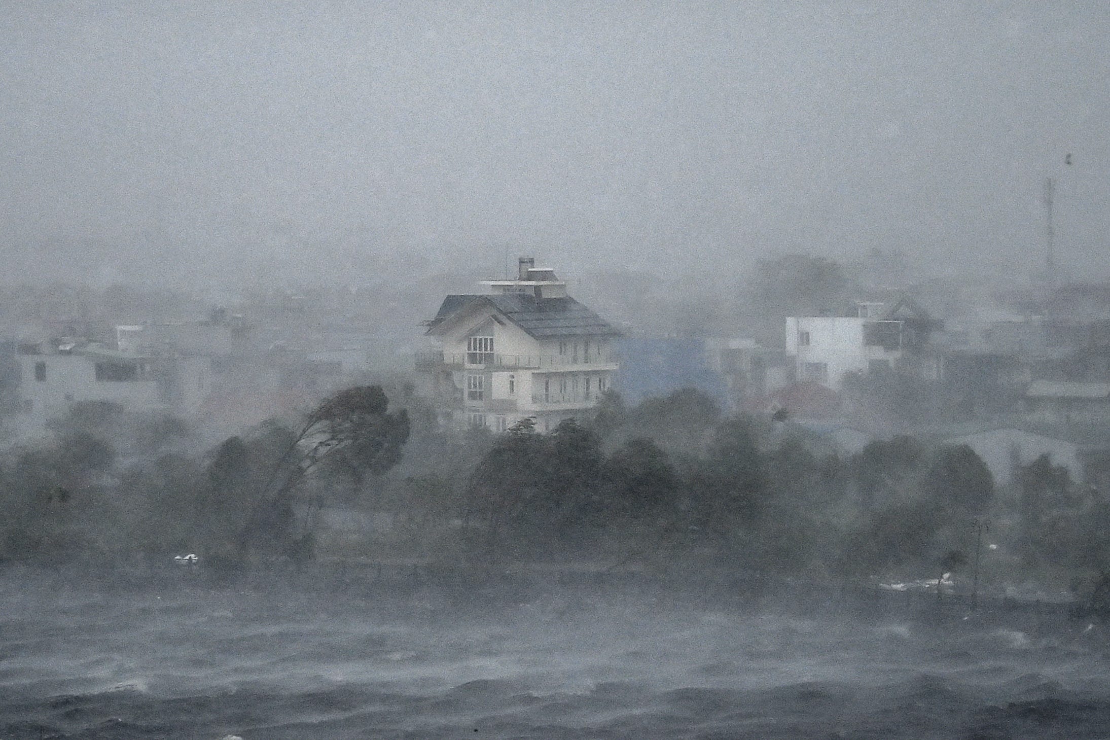 Water is whipped up by high winds onto the shore of Phuong Luu lake as Super Typhoon Yagi hits Hai Phong on September 7, 2024. Super Typhoon Yagi uprooted thousands of trees and swept ships and boats out to sea as it made landfall in northern Vietnam on September 7, state media said. (Photo by Nhac Nguyen/AFP Photo)