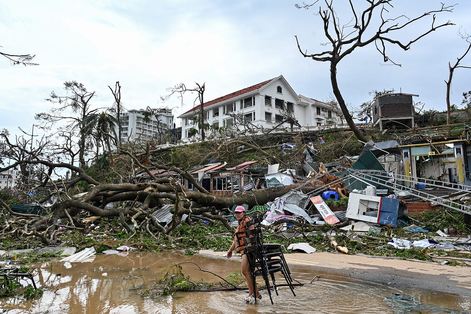 A woman collects chairs amid debris and fallen trees after Super Typhoon Yagi hit Ha Long, in Quang Ninh province, on September 8, 2024. Super Typhoon Yagi uproots thousands of trees, sweeps ships and boats out to sea and rips roofs off houses in northern Vietnam, after leaving a trail of destruction in southern China and the Philippines. (Photo by Nhac Nguyen/AFP Photo)