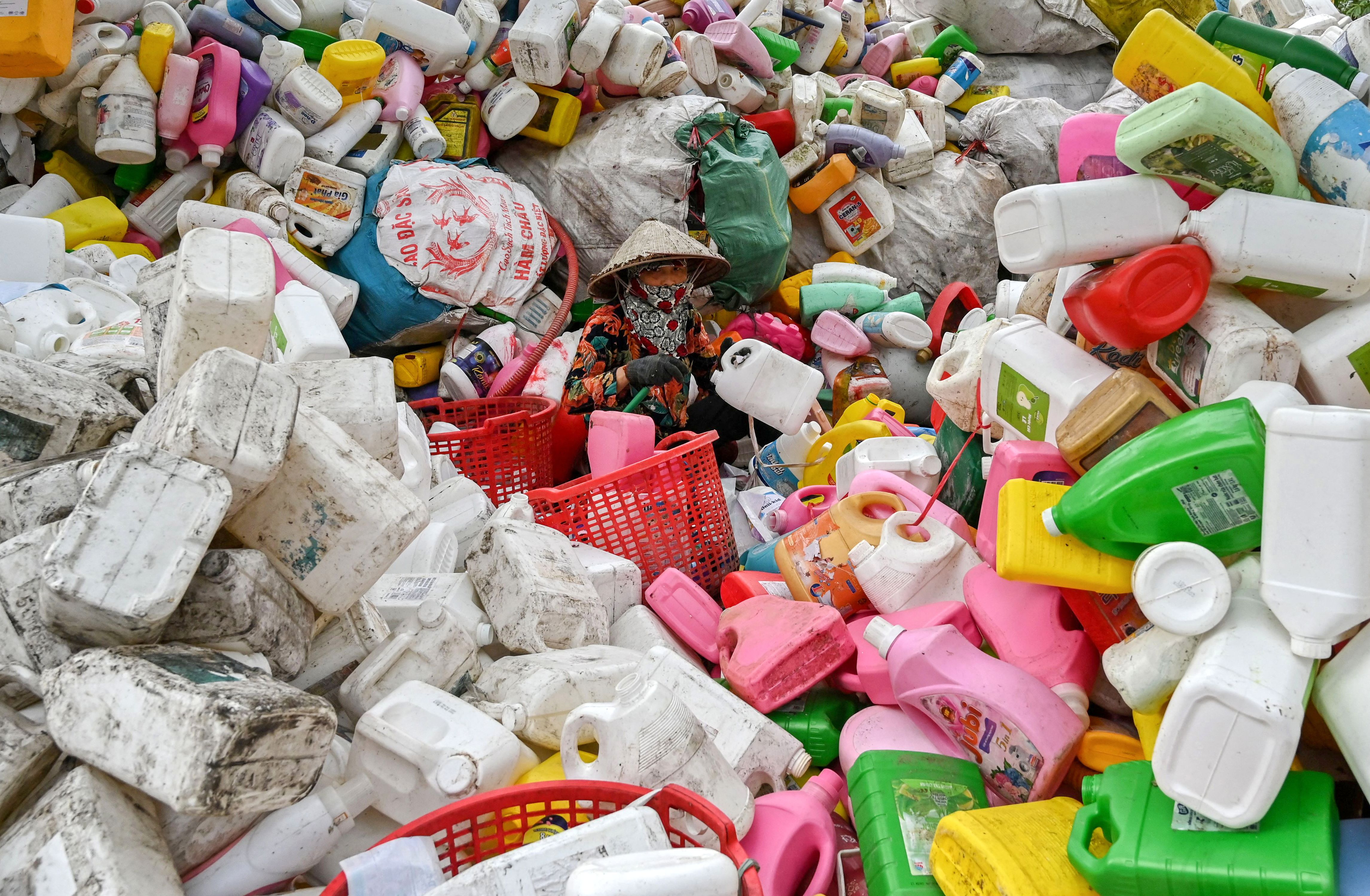 A worker sorts through plastic waste at a recycling site on the outskirts in Hanoi on September 17, 2024. (Photo by Nhac Nguyen/AFP Photo)
