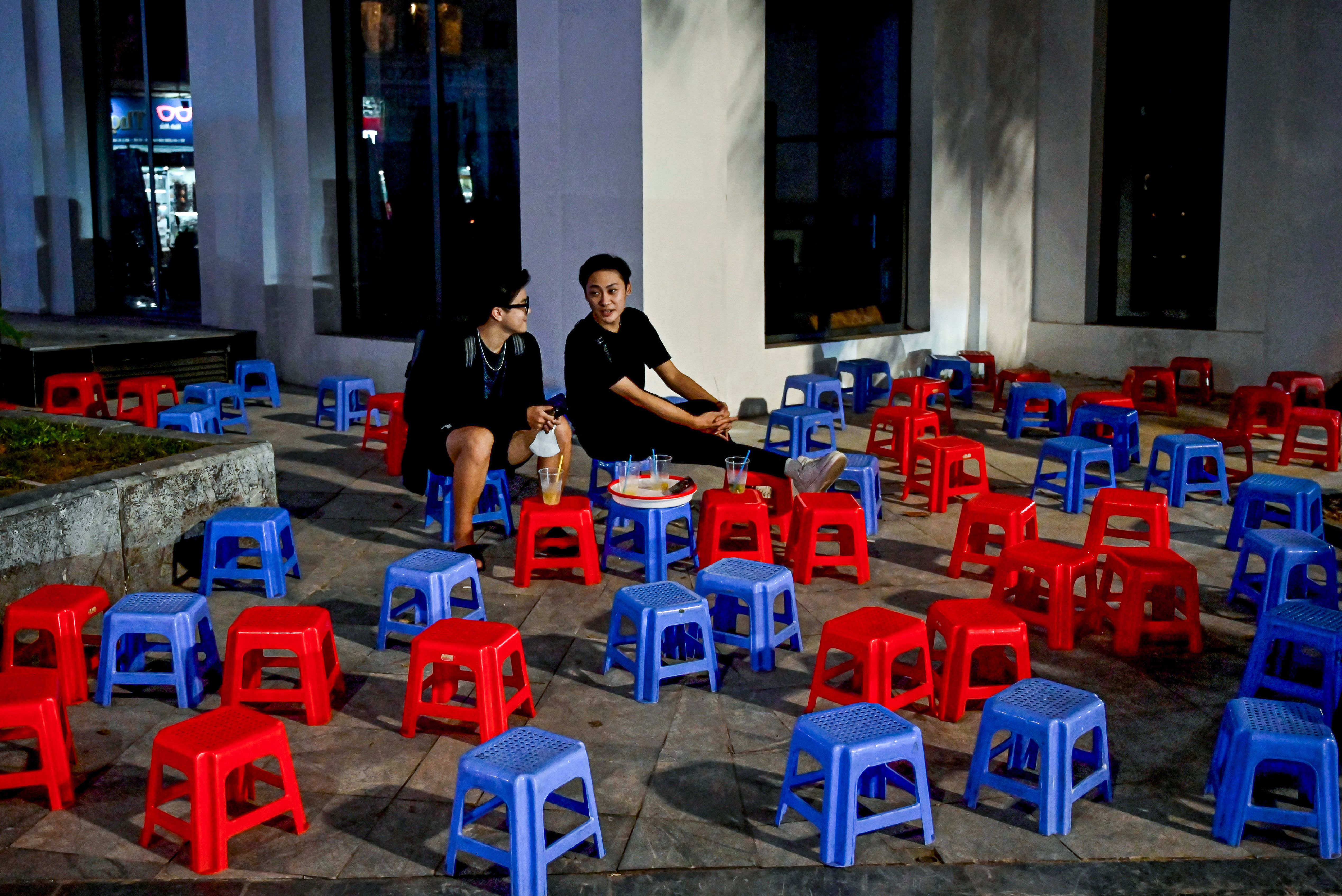 Customers enjoy drinks at a cafe terrace set up on a sidewalk in Hanoi on October 30, 2024. (Photo by Nhac Nguyen/AFP Photo)