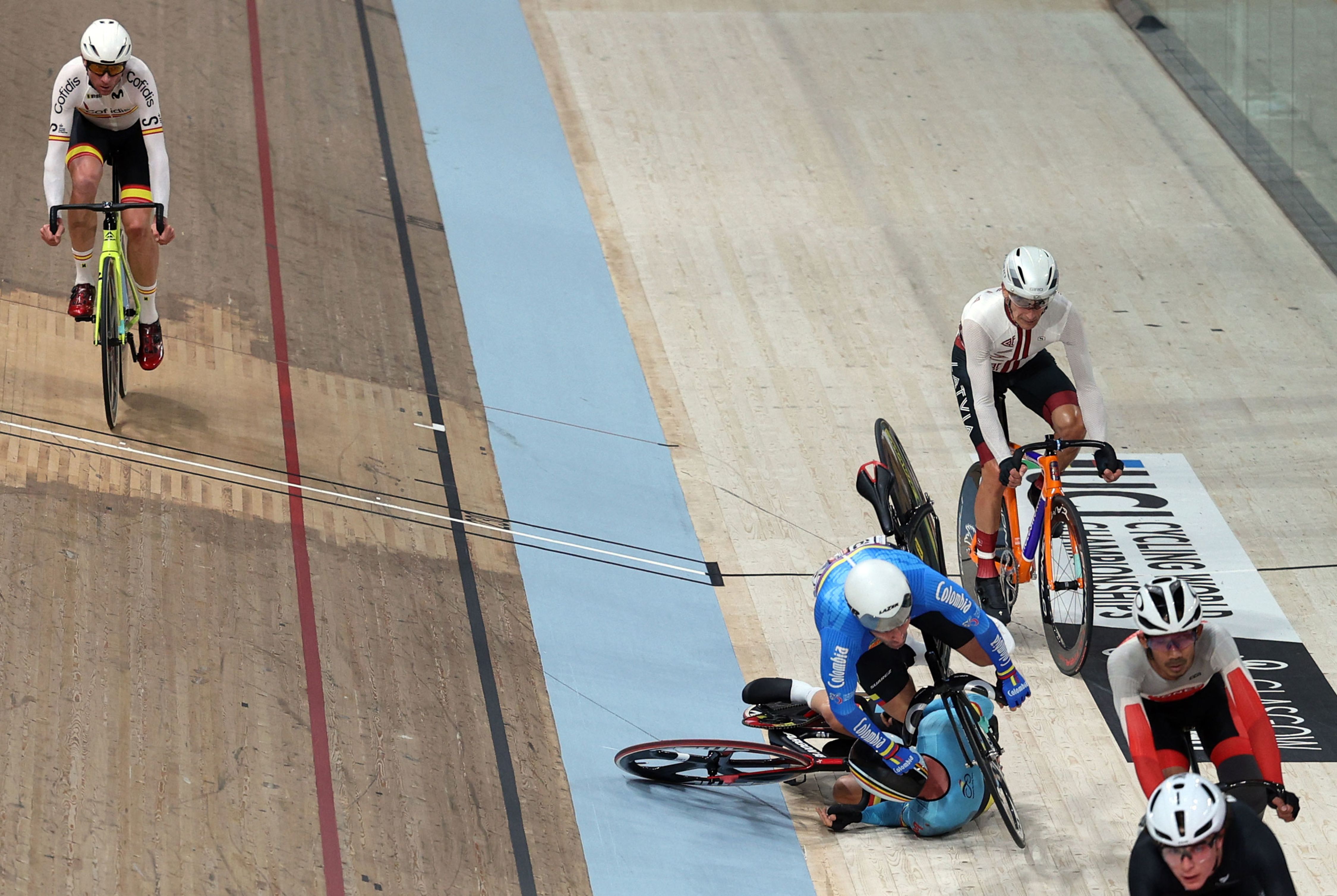 Columbia's Guido Cardona Maya and Belgium's Louis Clincke collide during the men's C4 para-cycling Scratch Race at the Sir Chris Hoy velodrome during the UCI Cycling World Championships in Glasgow, Scotland on August 6, 2023. (Photo by Adrian Dennis/AFP Photo)