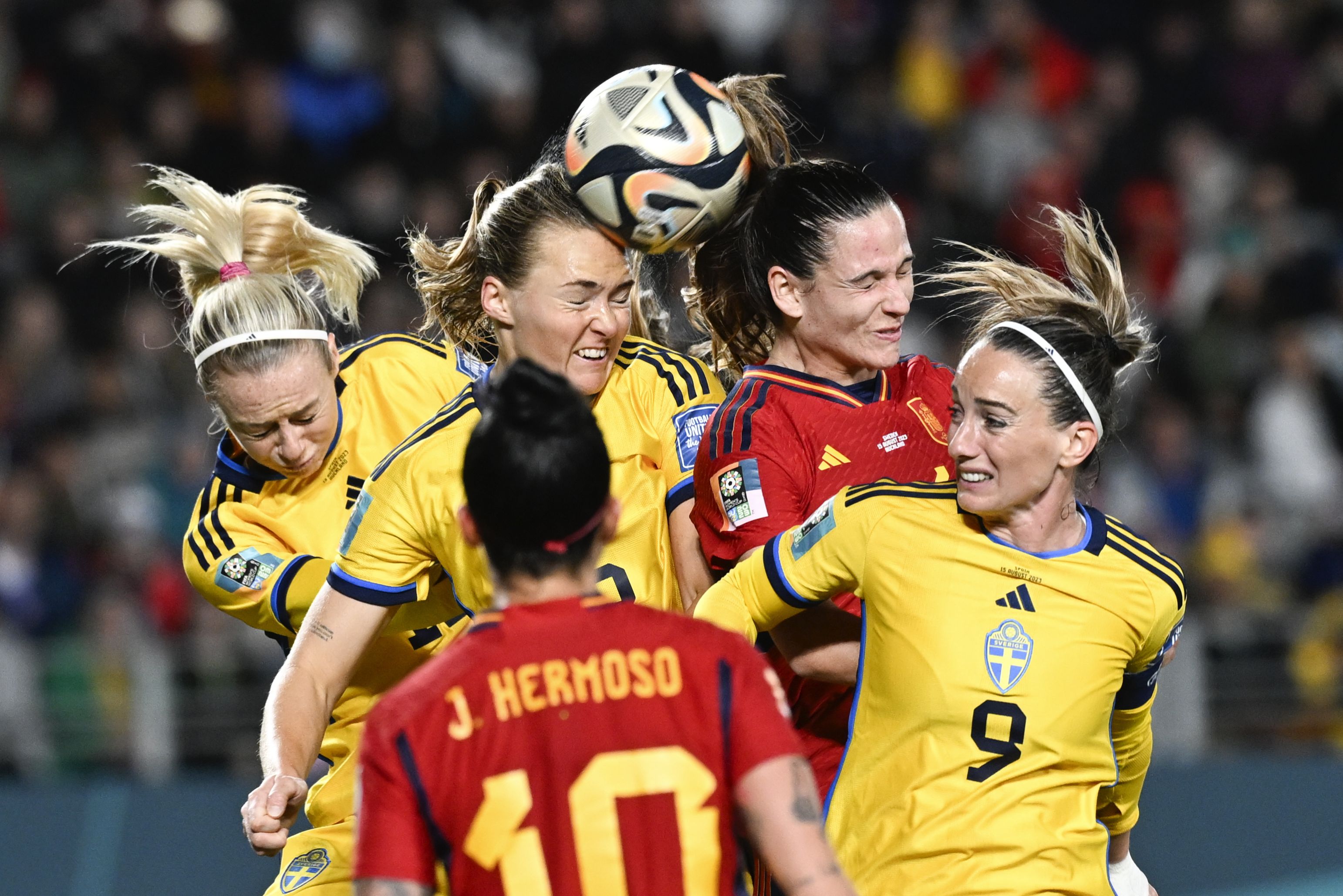 Player compete to head the ball during the Women's World Cup semifinal soccer match between Sweden and Spain at Eden Park in Auckland, New Zealand, Tuesday, August 15, 2023. (Photo by Andrew Cornaga/AP Photo)