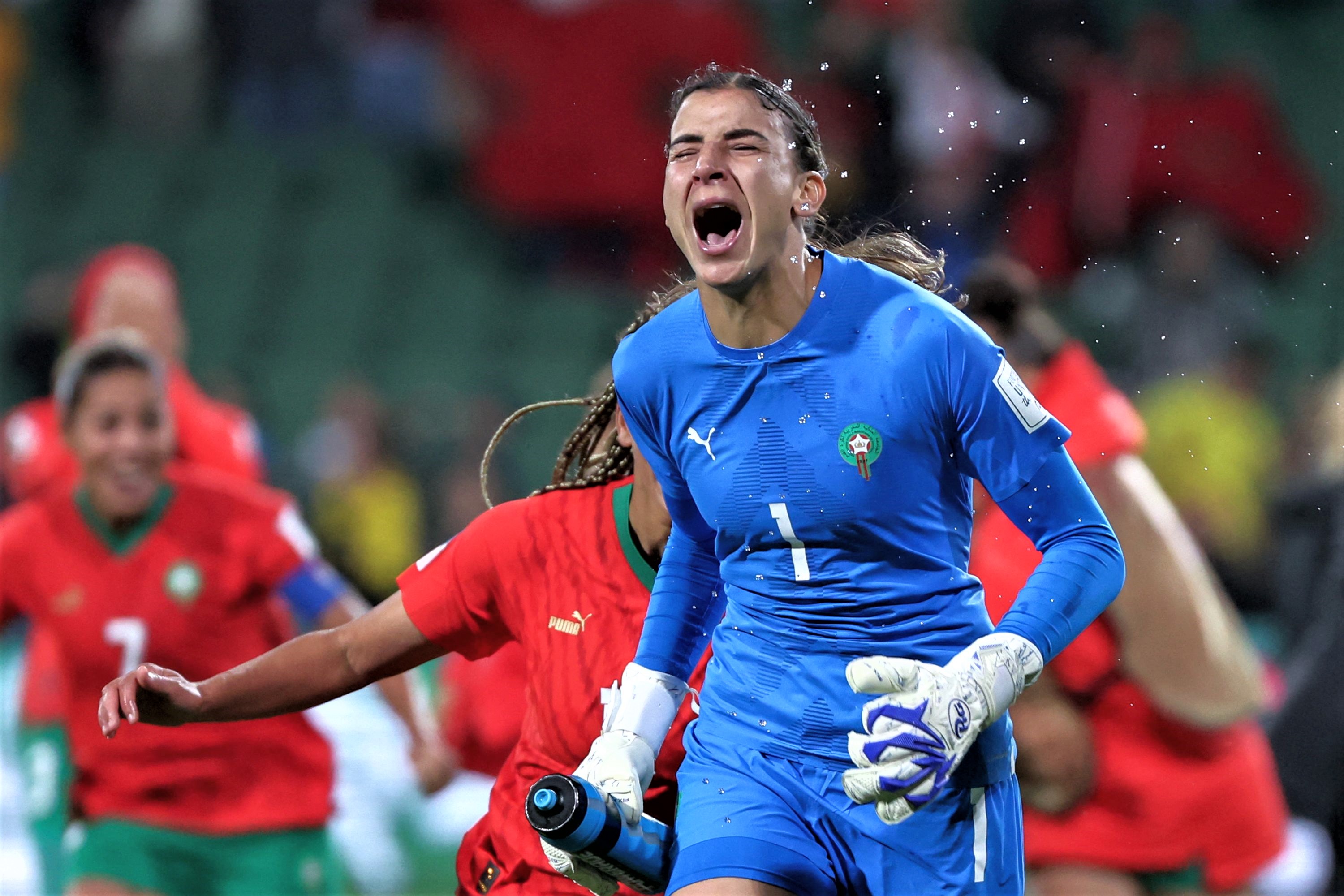 Morocco's goalkeeper #01 Khadija Er-Rmichi celebrates her team's victory and qualification to the knockout stage after the end of the Australia and New Zealand 2023 Women's World Cup Group H football match between Morocco and Colombia at Perth Rectangular Stadium in Perth on August 3, 2023. (Photo by Colin Murty/AFP Photo)