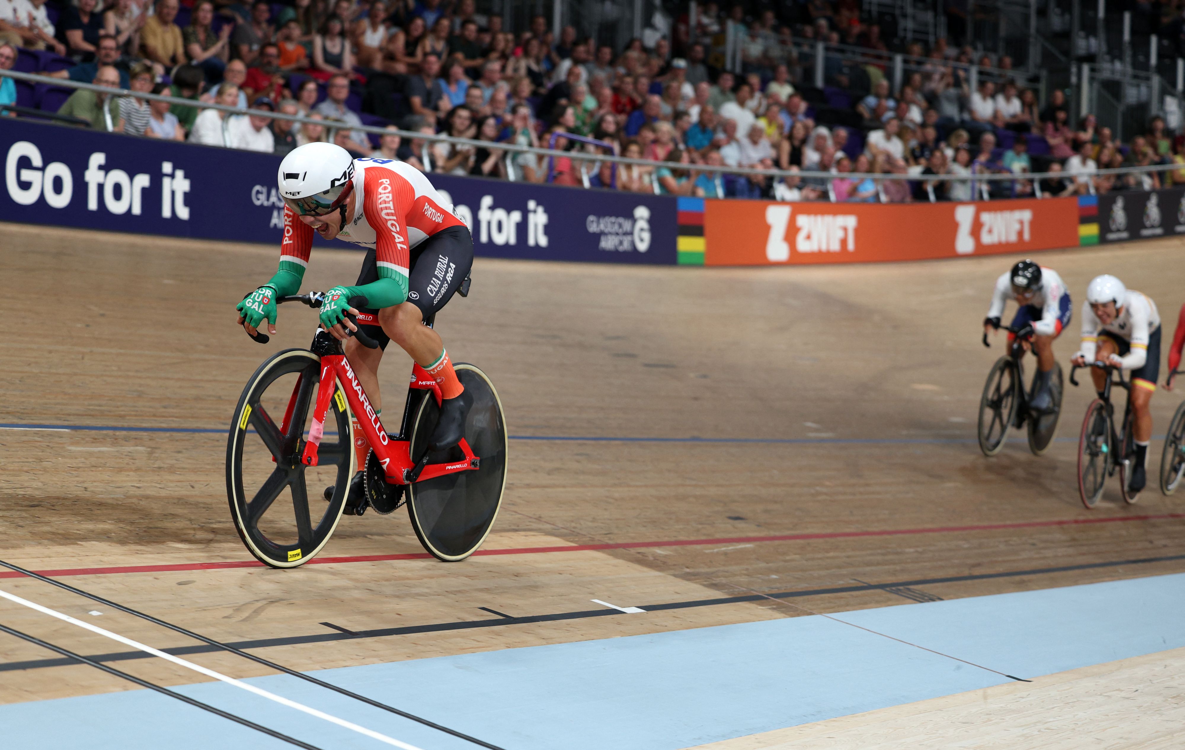 Portugal's Iuri Leitao celebrates winning the overall gold medal after the men's Elite Omnium Points Race at the Sir Chris Hoy velodrome during the UCI Cycling World Championships in Glasgow, Scotland on August 6, 2023 (Photo by Adrian Dennis/AFP Photo)
