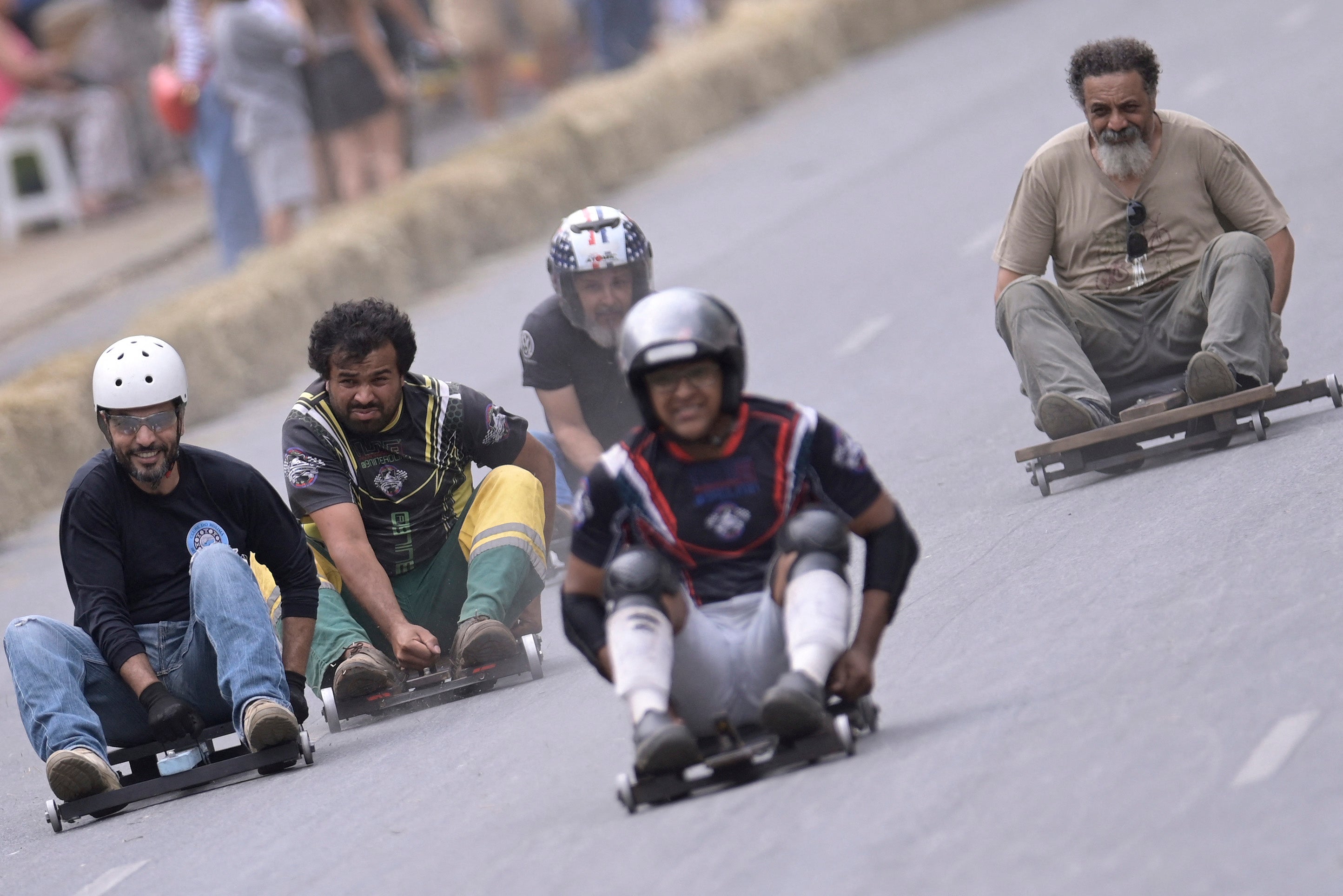 Soapbox cart riders race downhill during the 10th edition of the Rolima do Abacate event during the Virada Cultural festival in Belo Horizonte, state of Minas Gerais, Brazil, on August 20, 2023. (Photo by Douglas Magno/AFP Photo)