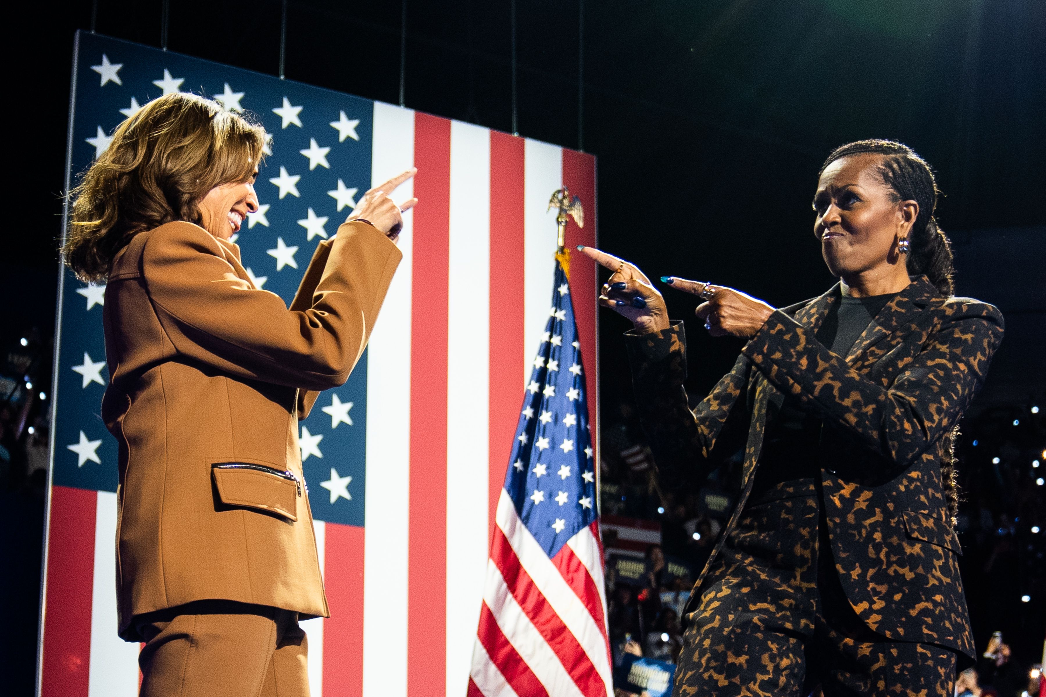 Democratic presidential candidate Vice President Kamala Harris and Former First Lady Michelle Obama during a campaign rally at Wings Event Center in Kalamazoo, MI, on October 26, 2024. (Photo by Demetrius Freeman/The Washington Post)