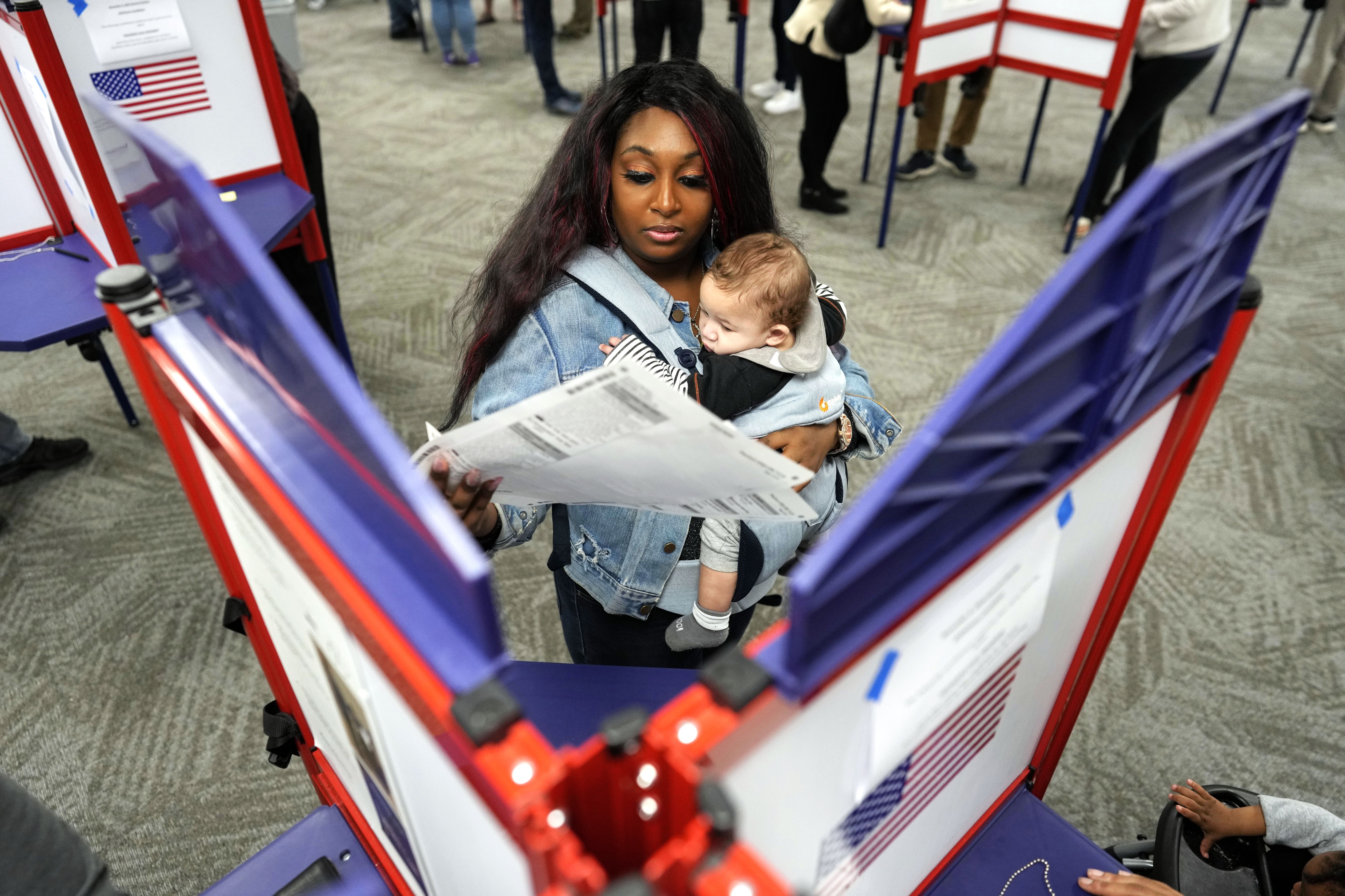 First-time voter Kayria Hildebran holds baby Kayden Hildebran as she fills out her ballot during in-person early voting at Hamilton County Board of Elections, Thursday, October 31, 2024, in Cincinnati. (Photo by Carolyn Kaster/AP Photo)