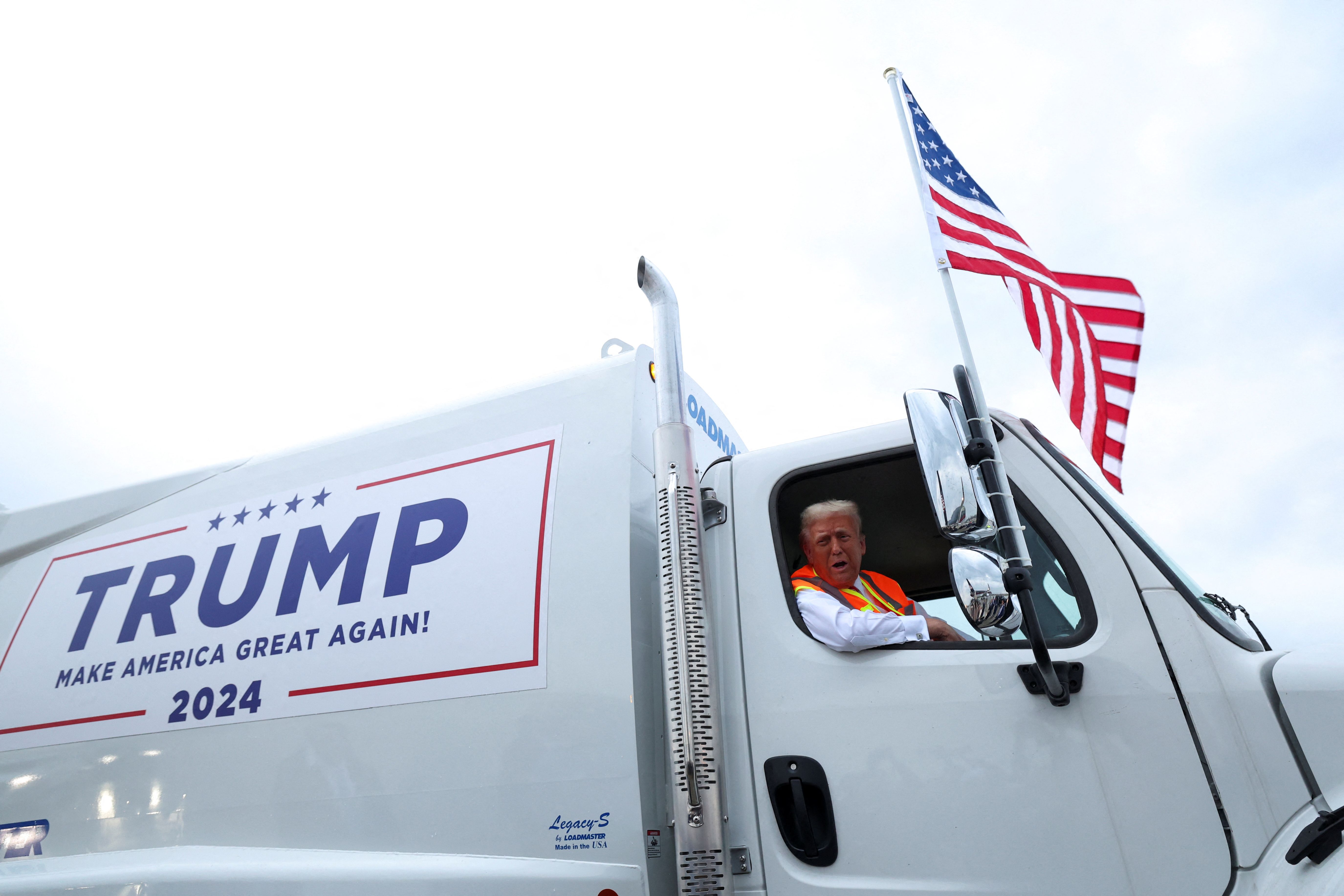 Republican presidential nominee and former U.S. President Donald Trump sits inside garbage truck, in Green Bay, Wisconsin on October 30, 2024. (Photo by Brendan McDermid/Reuters)