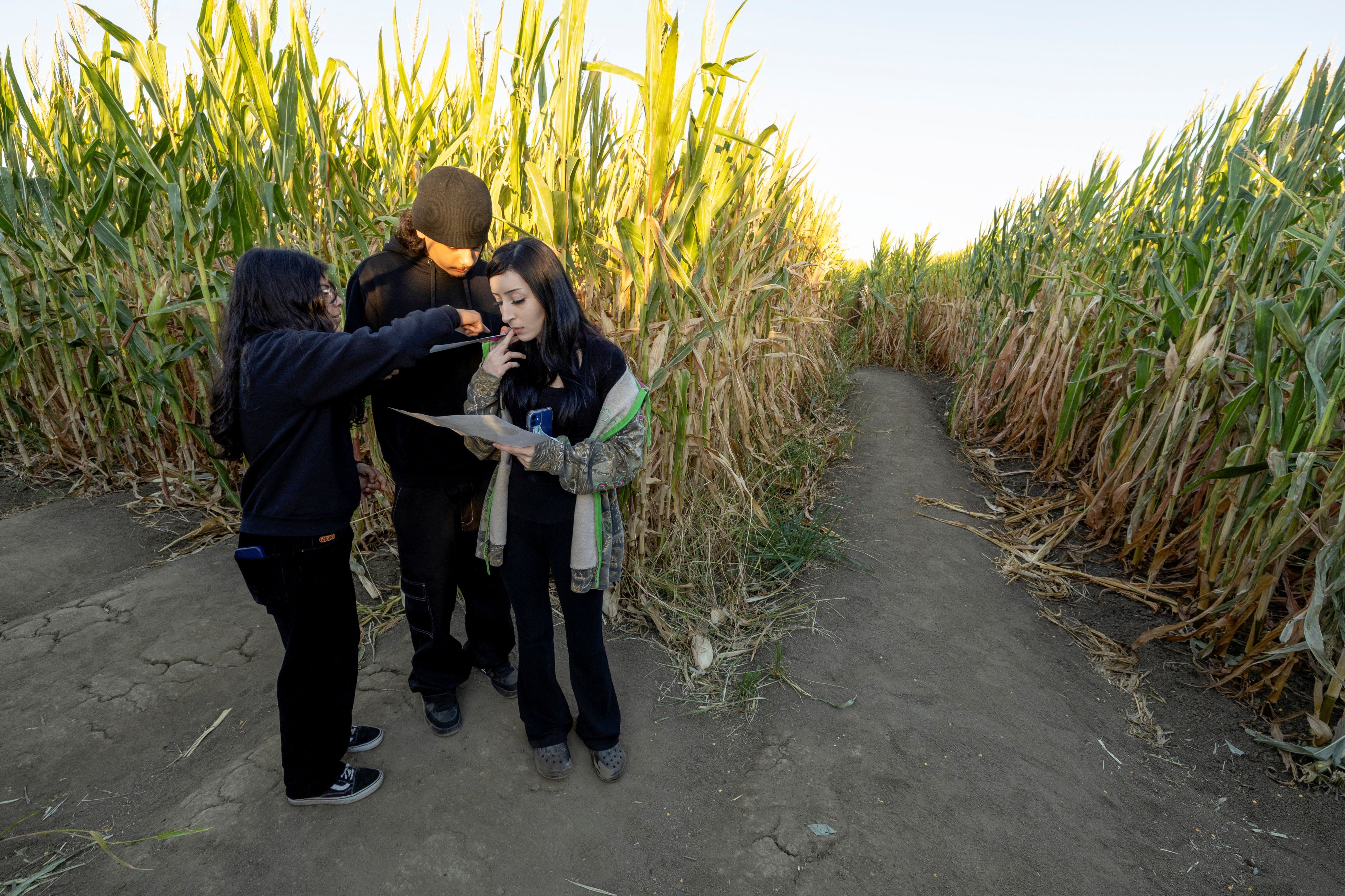 Visitors consult their maps at a crossroads while navigating one of the world's largest corn mazes at Cool Patch Pumpkins in Dixon, California on October 25, 2024. (Photo by Fred Greaves/Reuters)