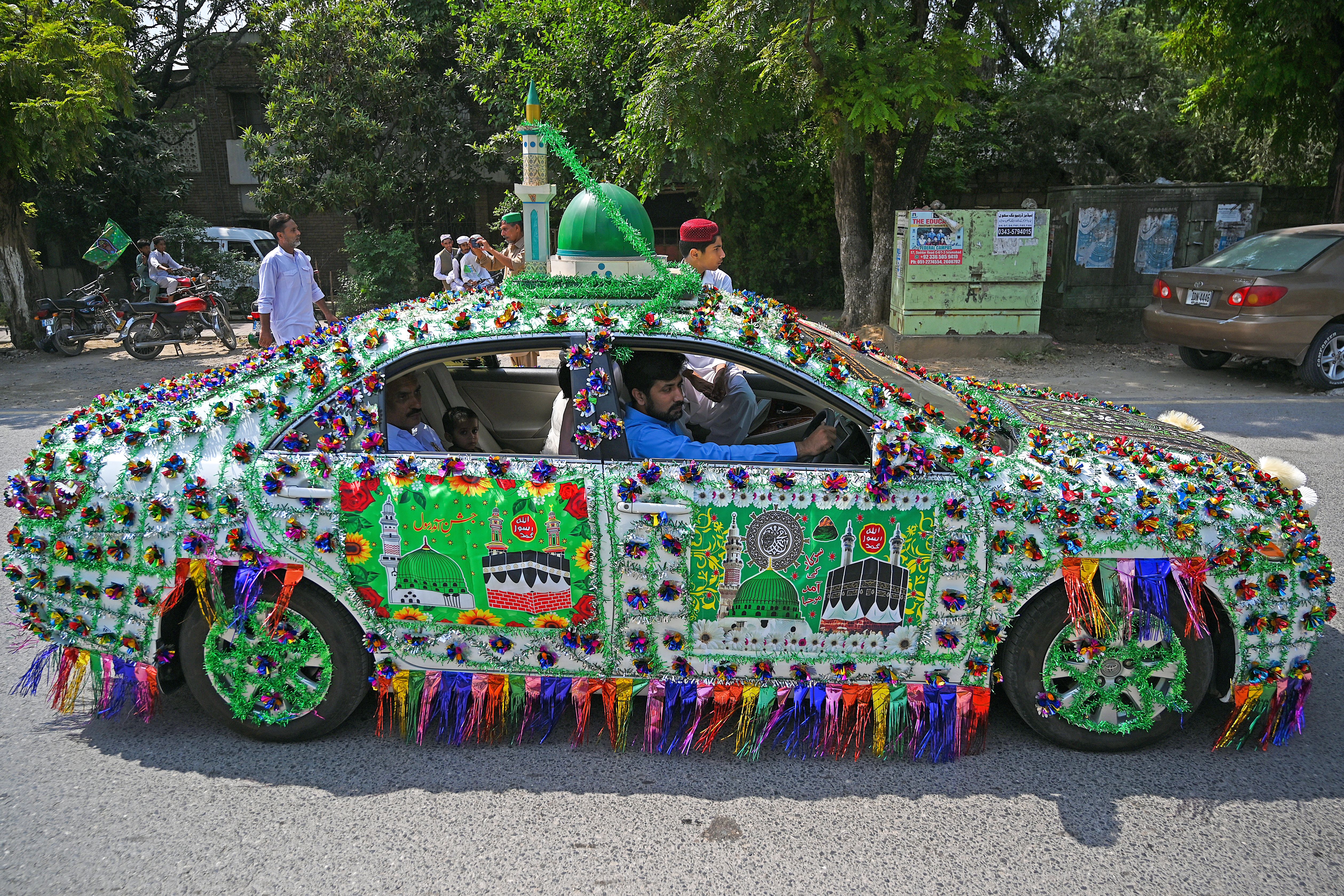Sunni Muslims ride on a decorated vehicle as they take part in a rally to celebrate Eid-e-Milad-un-Nabi, the birthday of Prophet Mohammed, in Islamabad on September 17, 2024. (Photo by Aamir Qureshi/AFP Photo)