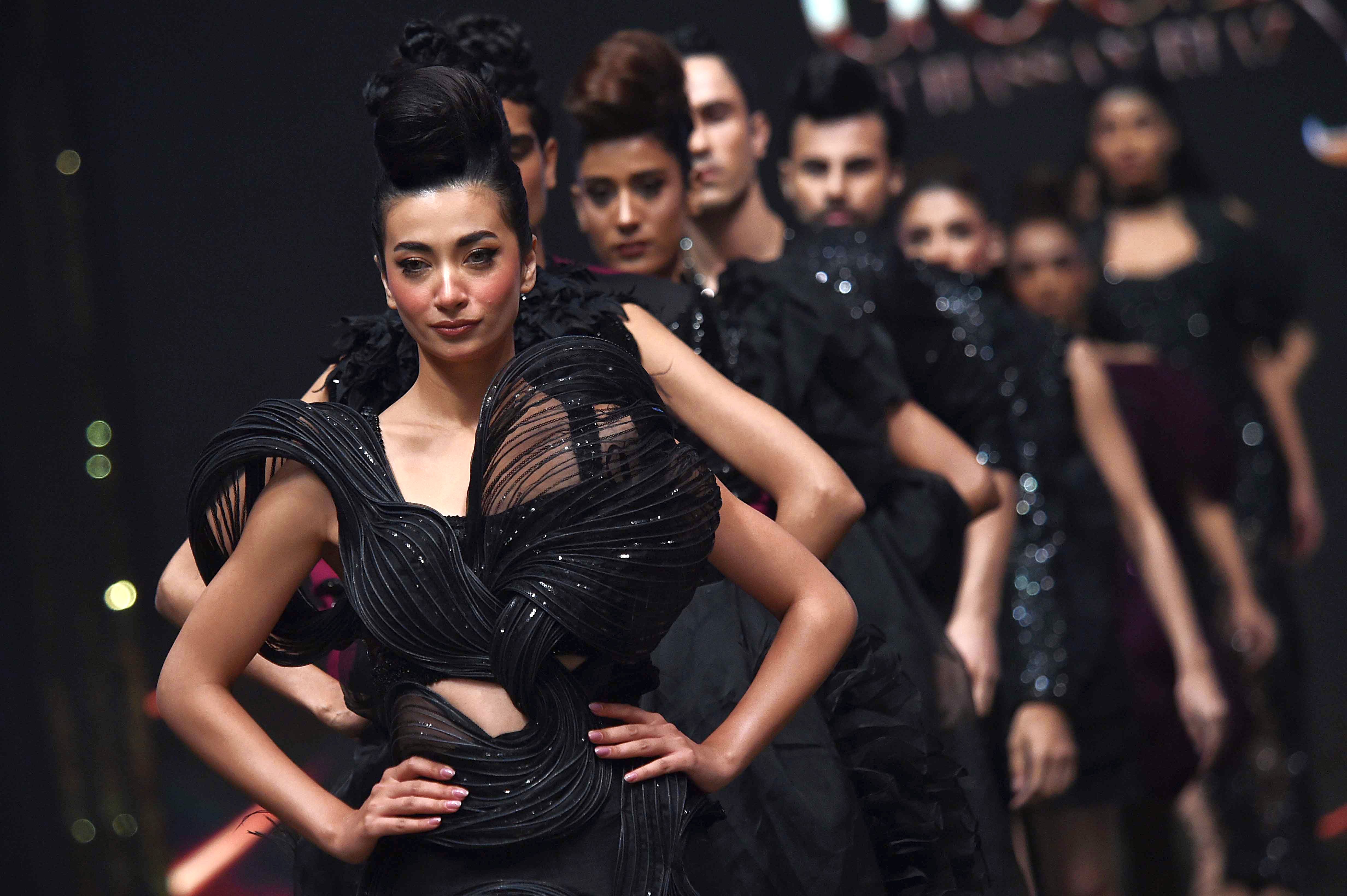 Models present creations by Gogi by Hassan Riaz brand during the TEXPO 2024 fashion show in Karachi, Pakistan, 23 October 2024. TEXPO 2024 is hosting a two-day fashion show from October 23-24 at Hotel Pearl Continental in Karachi, focusing on innovation and sustainability in fashion under the theme “Weaving the Way to Sustainability”. Featuring over 20 renowned designers, the event aims to promote eco-conscious practices within the textile industry. (Photo by Shahzaib Akber/EPA/EFE)