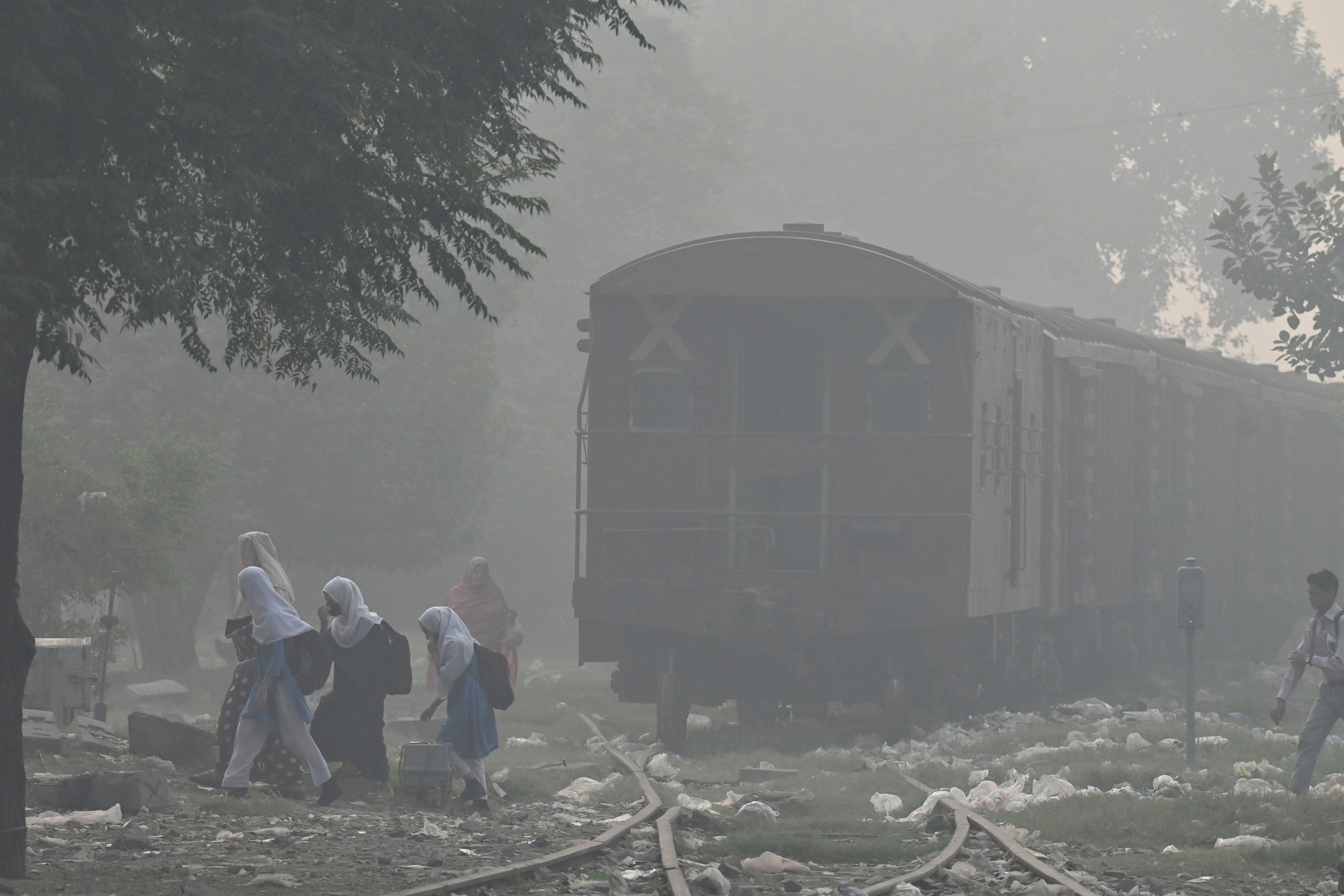 School girls walk across a railway track amid heavy smog in Lahore on October 29, 2024. (Photo by Arif Ali/AFP Photo)
