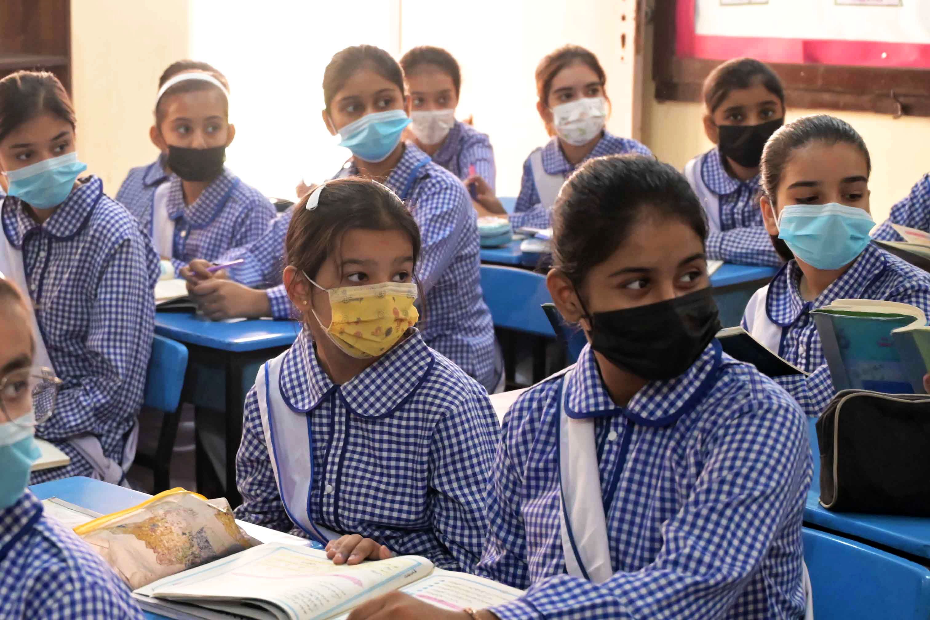 Students wear face masks attending their class in Lahore, Pakistan, 05 November 2024. The government of Punjab province, in eastern Pakistan, ordered the closure of all primary schools in its capital, Lahore, from 04 November, due to the high levels of air pollution recorded in recent days, reaching up to 45 times above the level recommended by the World Health Organization (WHO). Previous week, Lahore recorded the highest levels of air pollution among different cities across the world. (Photo by A. Hussain/EPA/EFE)