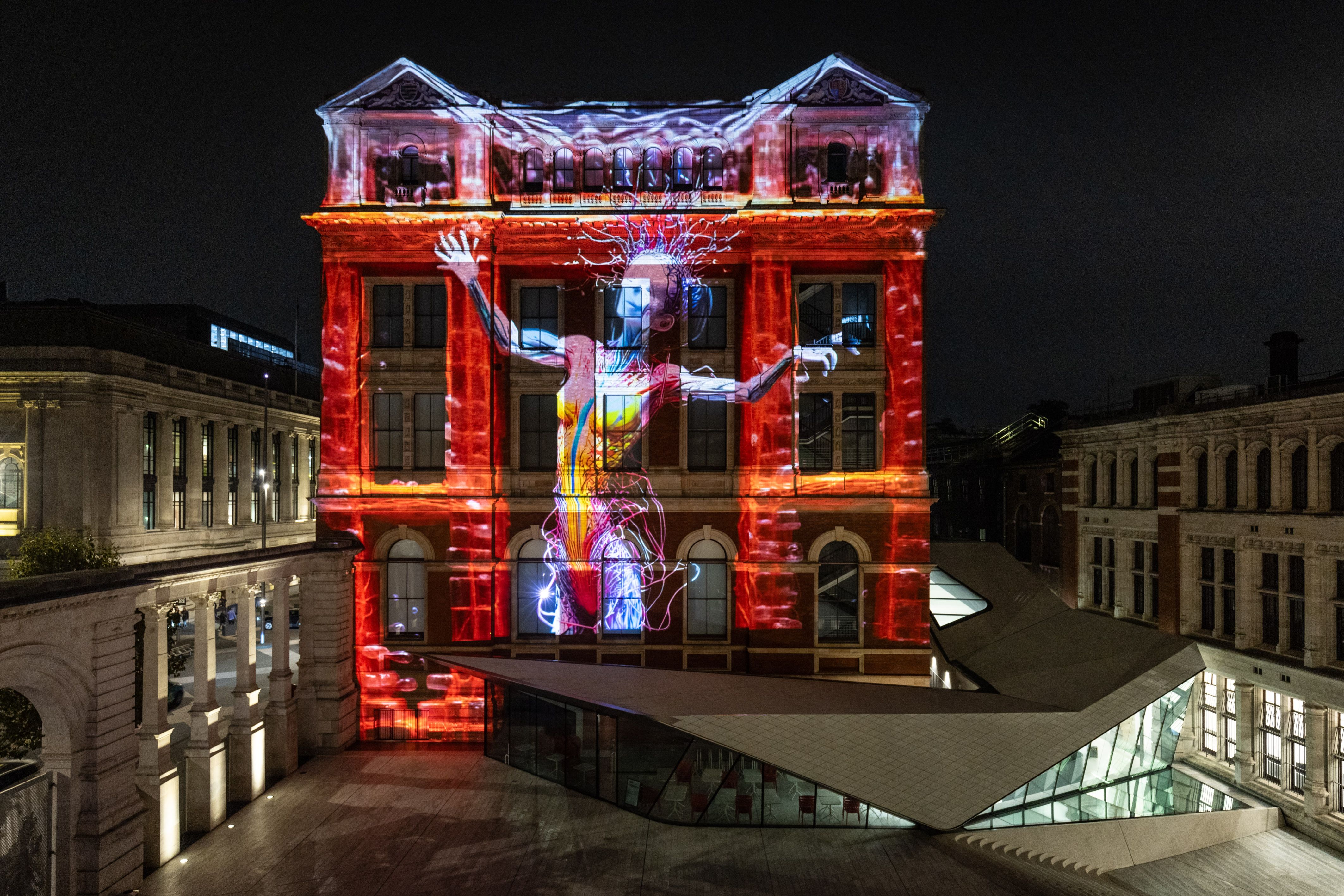 A preview of a specially commissioned AI artwork from Ouchhh Studio, made using cognitive technology to visualise brainwaves of the Arts & Film “Game Changers” is projected across the facade of the V&A's Exhibition Road Courtyard building in London on Thursday, October 31, 2024, ahead of it being publicly unveiled tomorrow night as part of The National Lottery's 30th birthday celebrations. (Photo by James Speakman/PA Media Assignments)