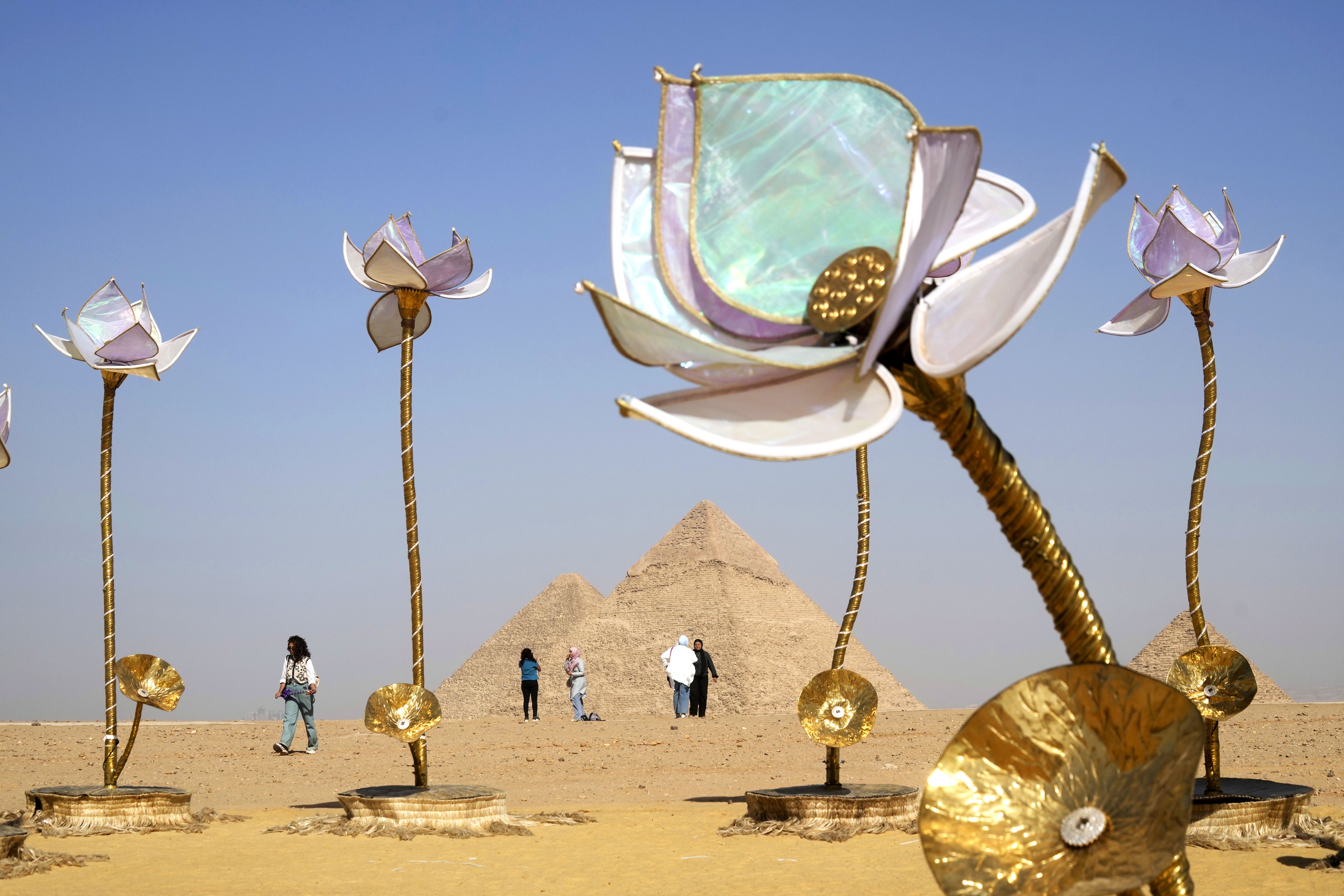 Visitors walk past “Padma/Pulse and Bloom” art work of Indian artist Shilo Shiv Suleman during “Forever Is Now” contemporary art exhibition at the historical site of the Giza Pyramids, on the outskirts of Cairo, Egypt, Thursday, October 24, 2024. (Photo by Amr Nabil/AP Photo)