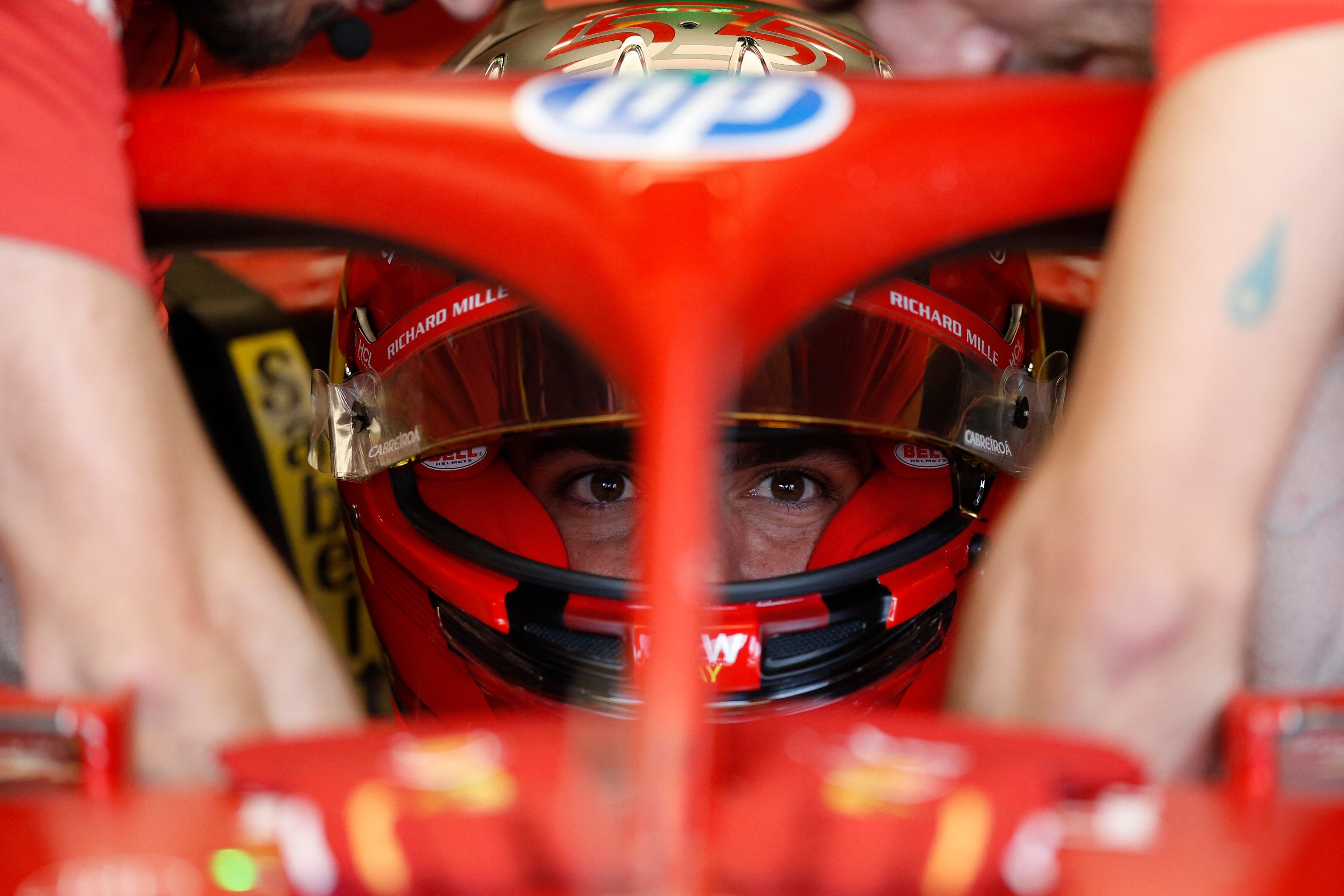 Ferrari's Spanish driver Carlos Sainz sits inside his car during the first practice session at the Jose Carlos Pace racetrack, aka Interlagos, in Sao Paulo, Brazil, on November 1st, 2024, ahead of the upcoming Formula One Sao Paulo Grand Prix next November 3. (Photo by Miguel Schincariol/AFP Photo)