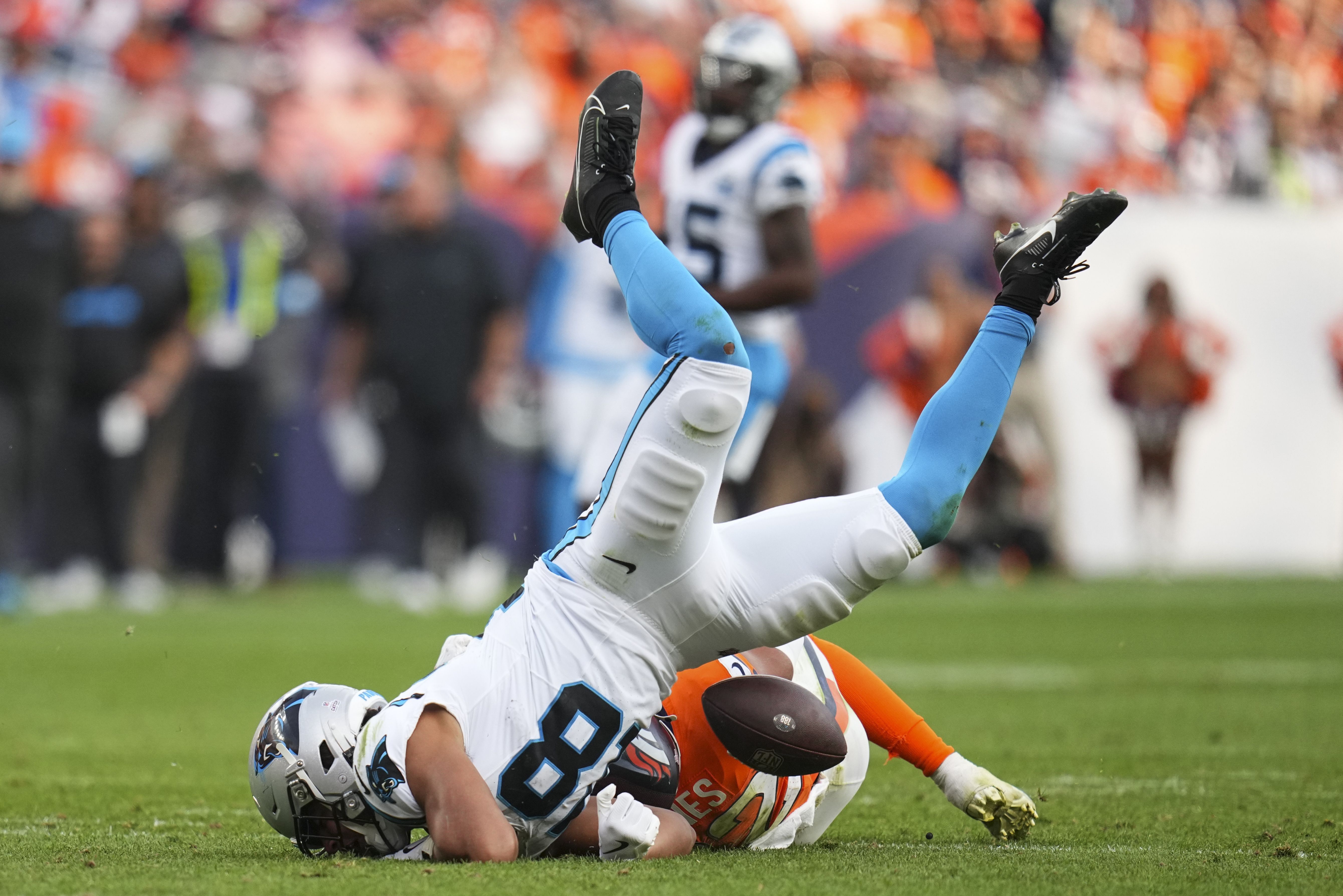 Denver Broncos safety Brandon Jones (22) tackles Carolina Panthers wide receiver Jalen Coker (18) during the second half of an NFL football game Sunday, October 27, 2024, in Denver. (Photo by Jack Dempsey/AP Photo)