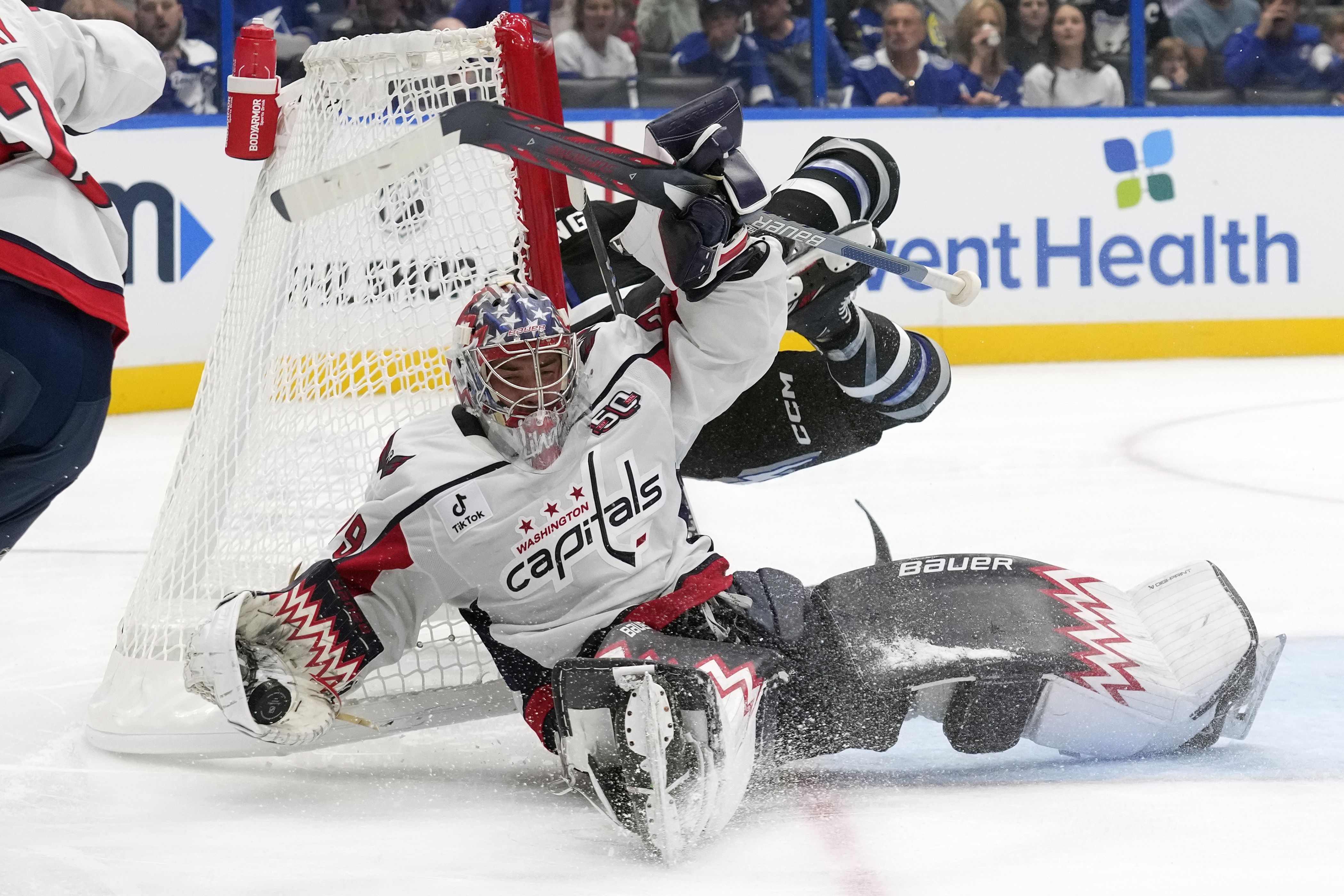 Washington Capitals goaltender Charlie Lindgren (79) makes a save as he gets knocked over by Tampa Bay Lightning center Luke Glendening during the second period of an NHL hockey game Saturday, October 26, 2024, in Tampa, Fla. (Photo by Chris O'Meara/AP Photo)