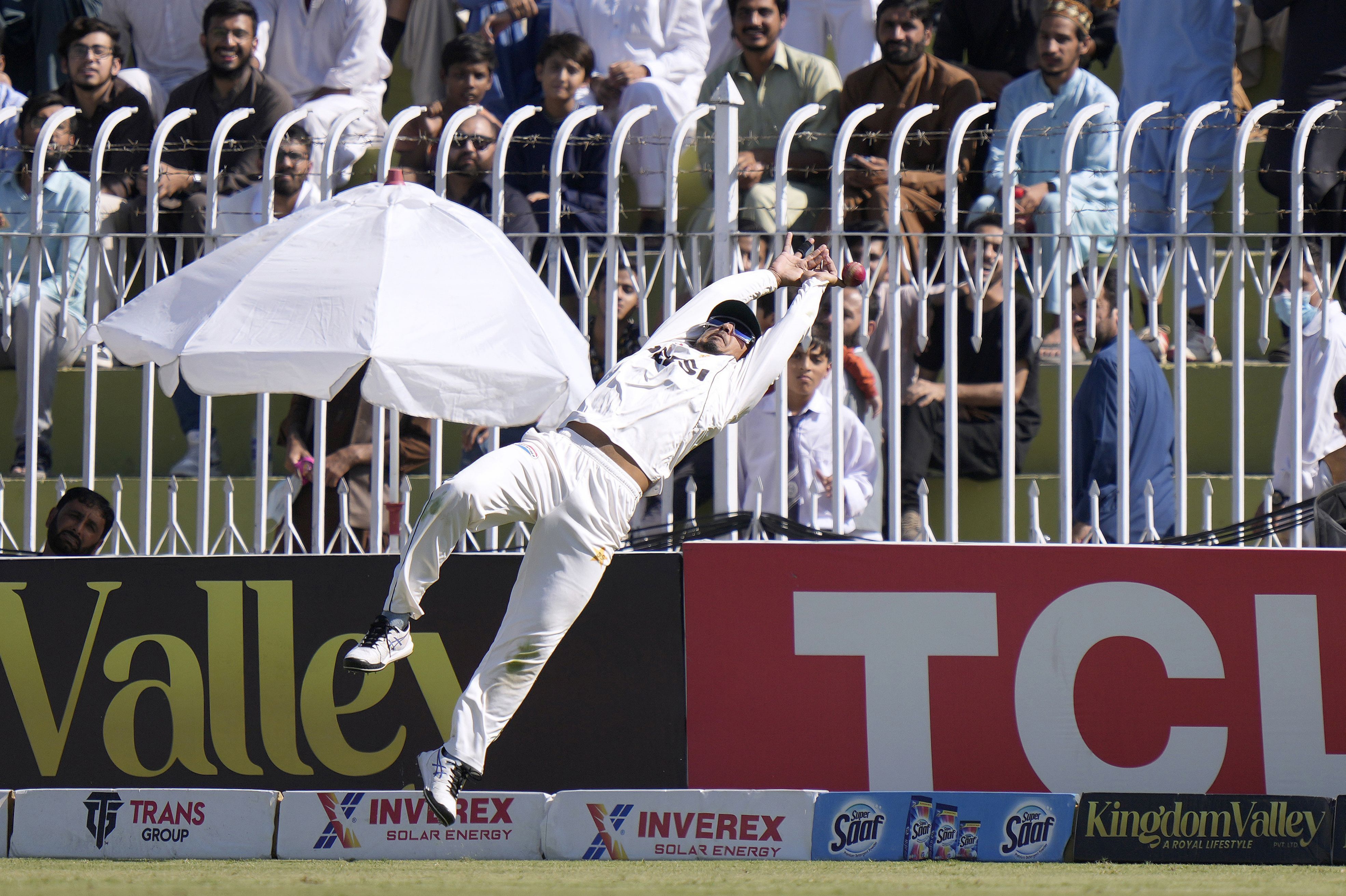 Pakistan's Saim Ayub jumps but fails to take a catch from a shot by England's Jamie Smith on the boundary edge during day one of the third test cricket match between Pakistan and England, in Rawalpindi, Pakistan, Thursday, October 24, 2024. (Photo by Anjum Naveed/AP Photo)