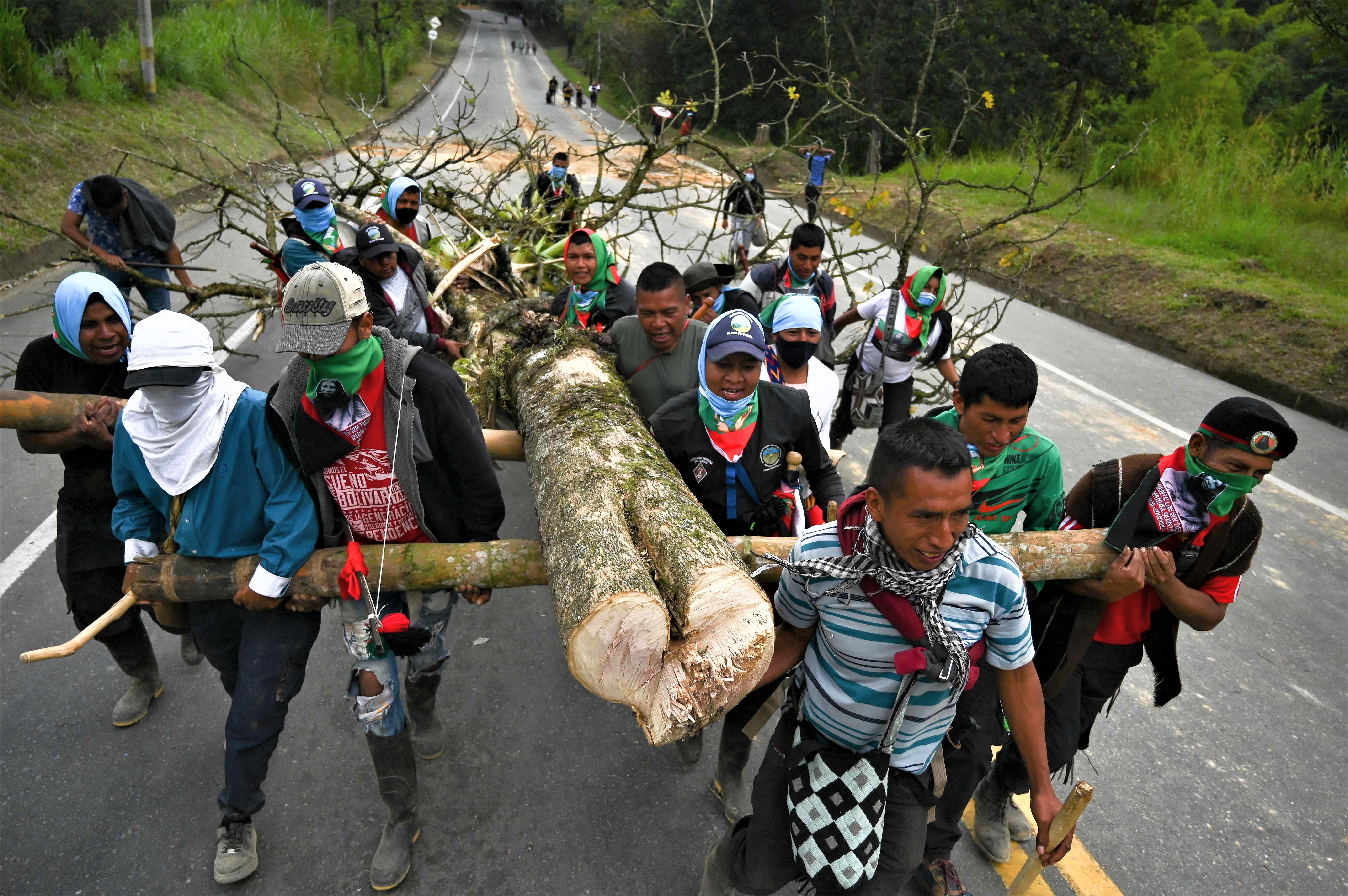 Indigenous people hold a demonstration blocking the Pan-American highway to protest against the Colombian government and demanding land rights in the region and better health and education conditions in Piendamo municipality, Cauca department, Colombia, on August 1, 2023. (Photo by Joaquin Sarmiento/AFP Photo)