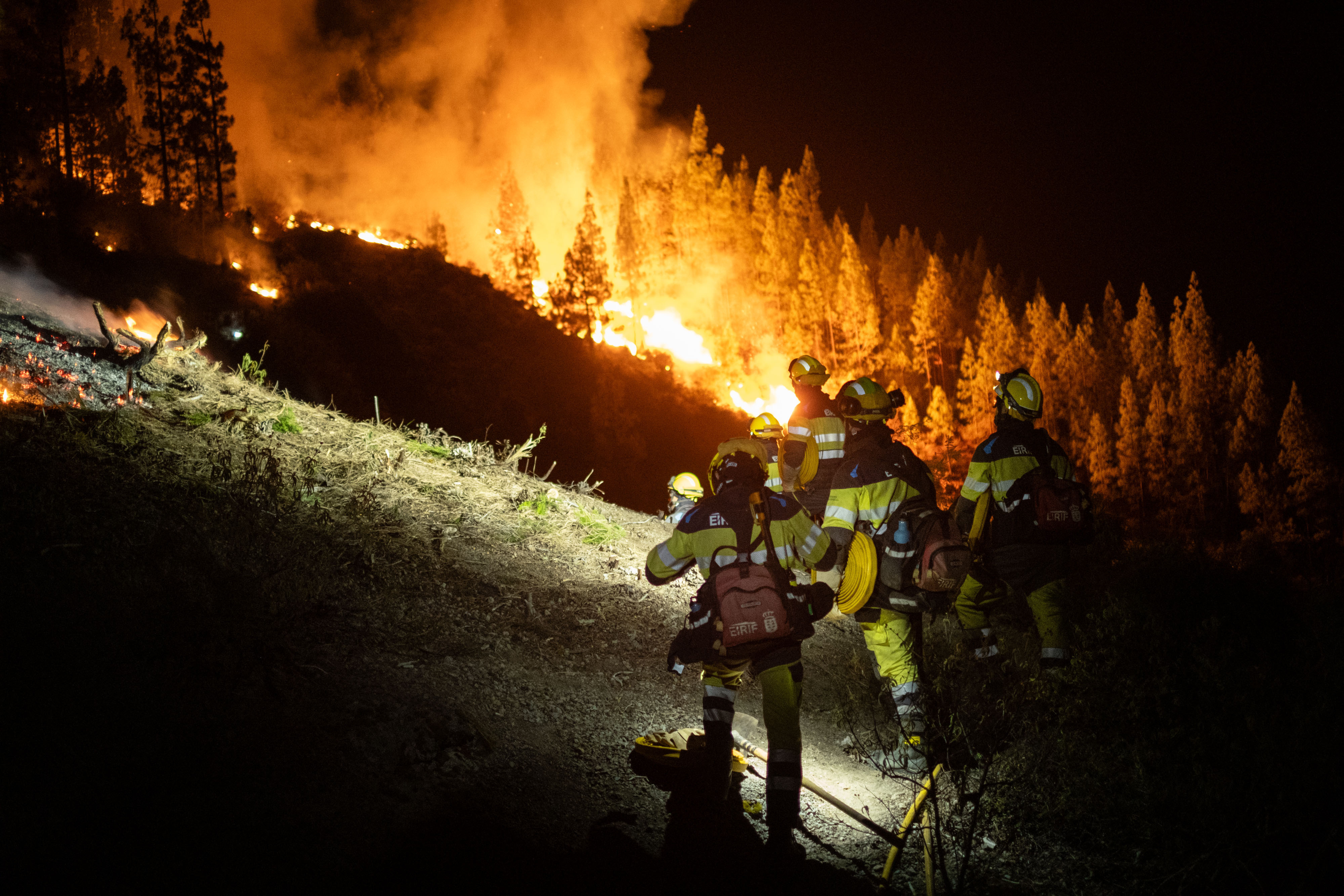 Agents of EIRIF, a unit in charge of the Government of the Canary Islands, work at night to extinguish the forest fire declared on the island of Tenerife, Canary Islands on August 16, 2023. The Tenerife fire continues out of control: more than 1,800 hectares affected and 150 people evacuated. (Photo by Andres Gutierrez/Anadolu Agency via Getty Images)
