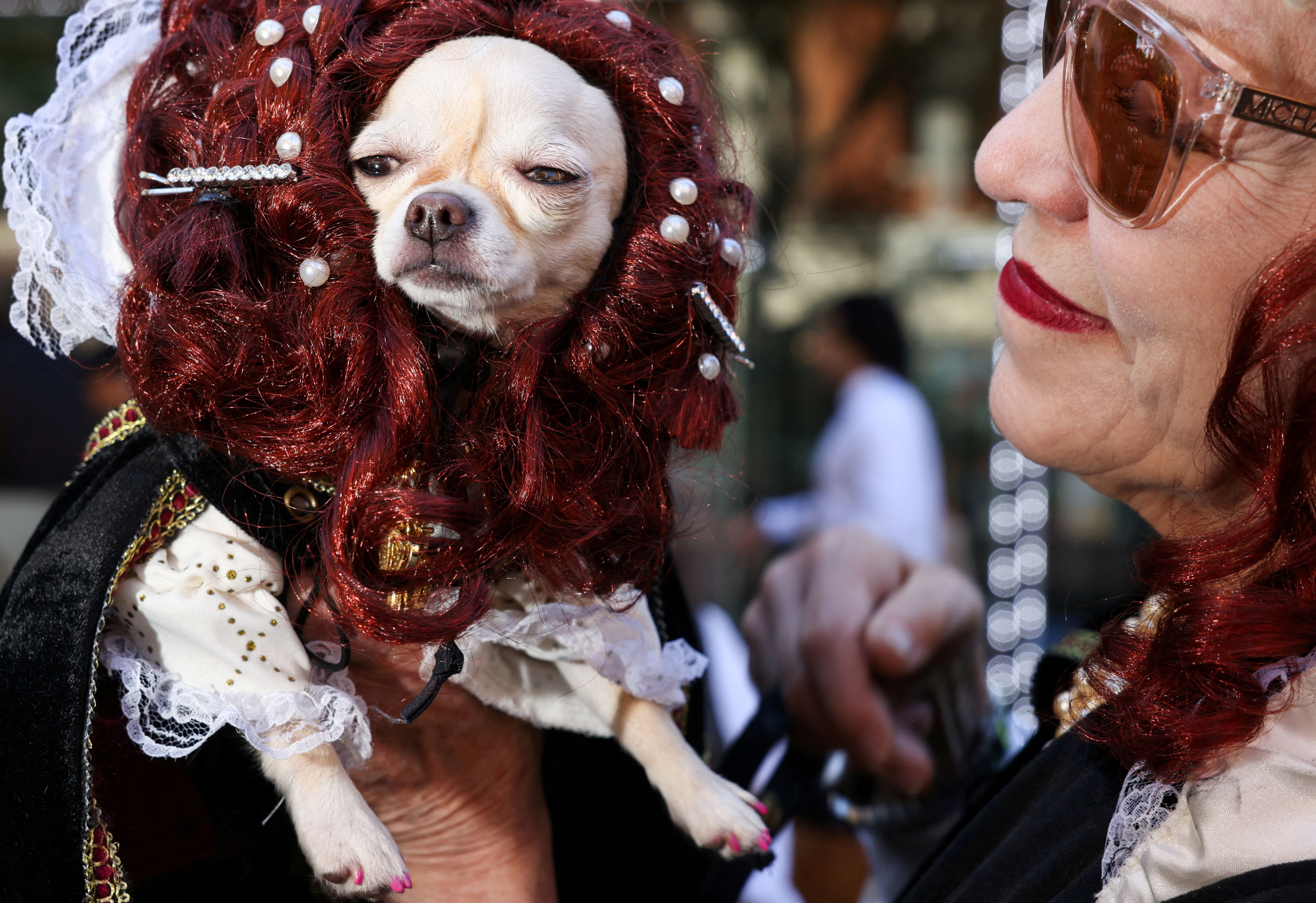 Cleo, a chihuahua, is dressed as Elizabeth the I with her owner before the Halloween Dog Parade in New York City, U.S., October 19, 2024. (Photo by Caitlin Ochs/Reuters)
