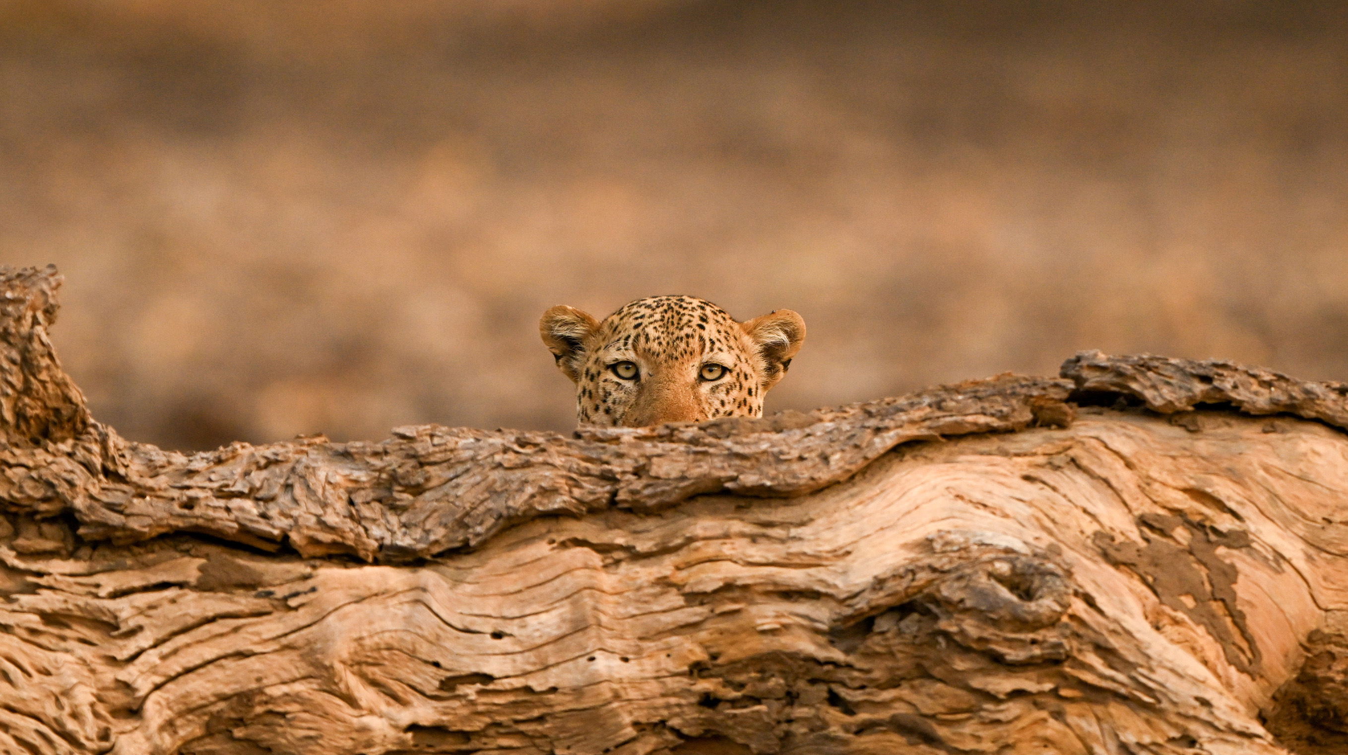 A leopard plays peekaboo with the photographer Nick Dale at the Mana Pools National Park in Zimbabwe in the last decade of October 2024. (Photo by Nick Dale/Solent News)