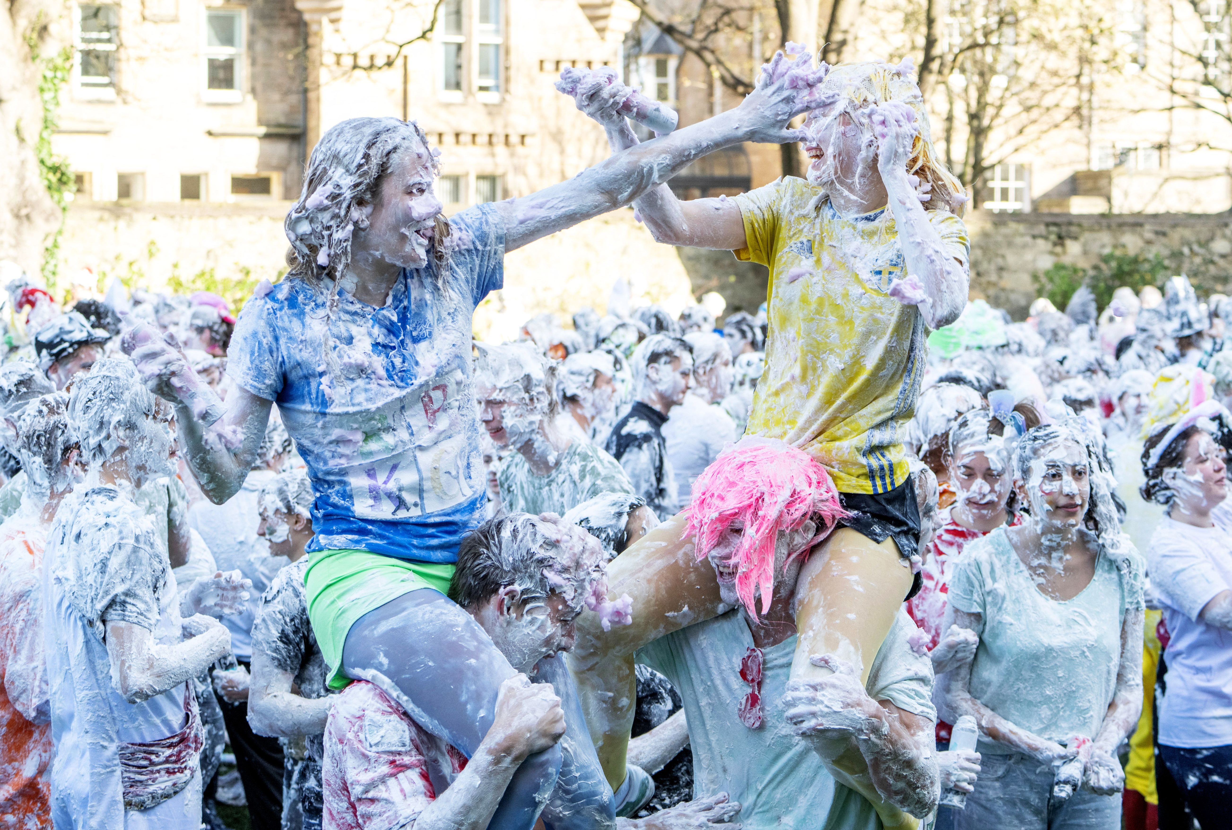 Students from St Andrews University are covered in foam as they leave after taking part in the traditional “Raisin Weekend” in the Lower College Lawn, at St Andrews in Scotland, Britain, on October 21, 2024. (Photo by Lesley Martin/Reuters)