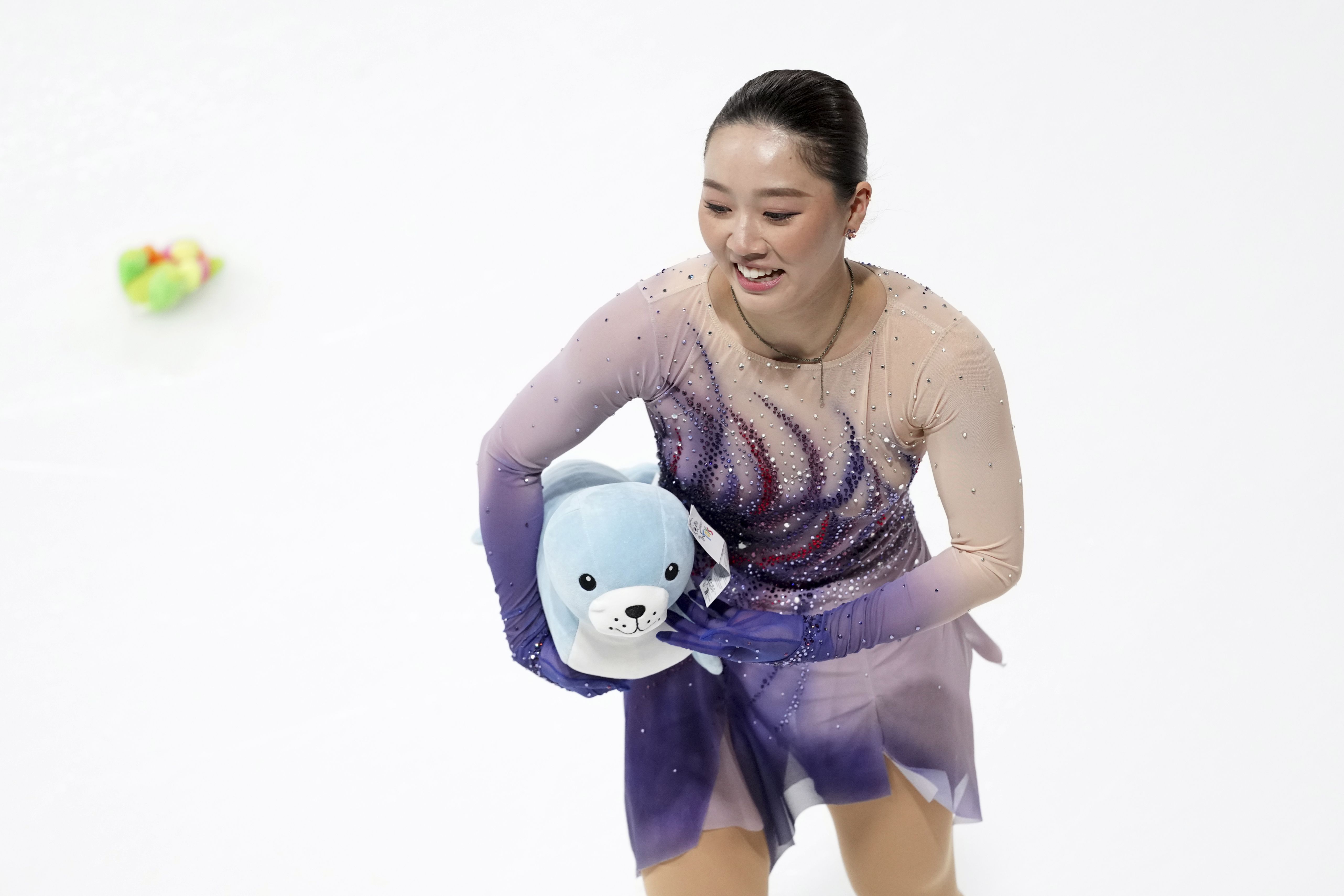 Wakaba Higuchi, of Japan, smiles after competing in the women's free skating segment at the ISU Grand Prix of Figure Skating, Saturday, November 2, 2024, in Angers, France. (Photo by Aurelien Morissard/AP Photo)