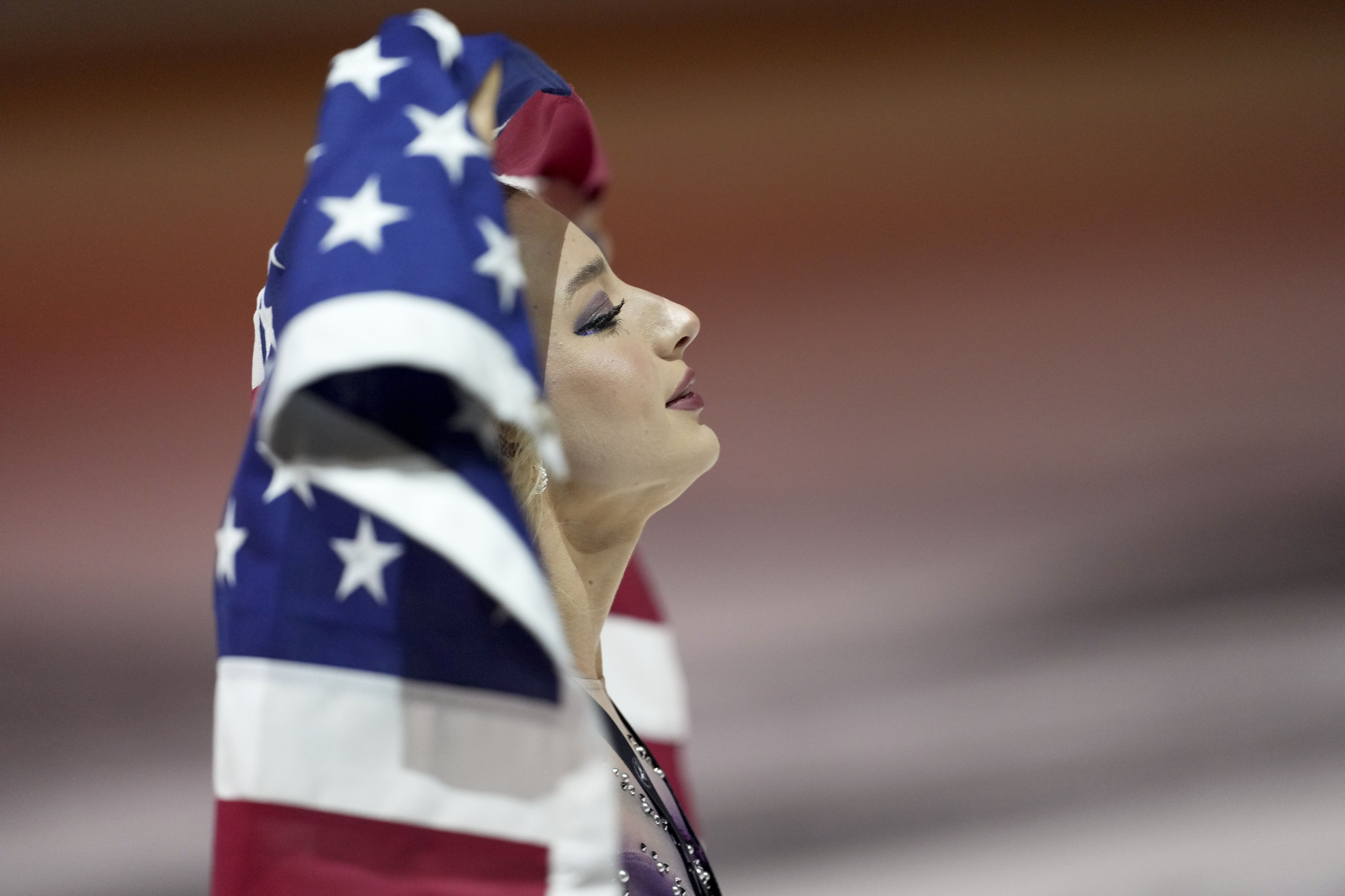 Amber Glenn, of the United States, poses after winning the gold medal in the women's event at the ISU Grand Prix of Figure Skating, Saturday, November 2, 2024, in Angers, France. (Photo by Aurelien Morissard/AP Photo)