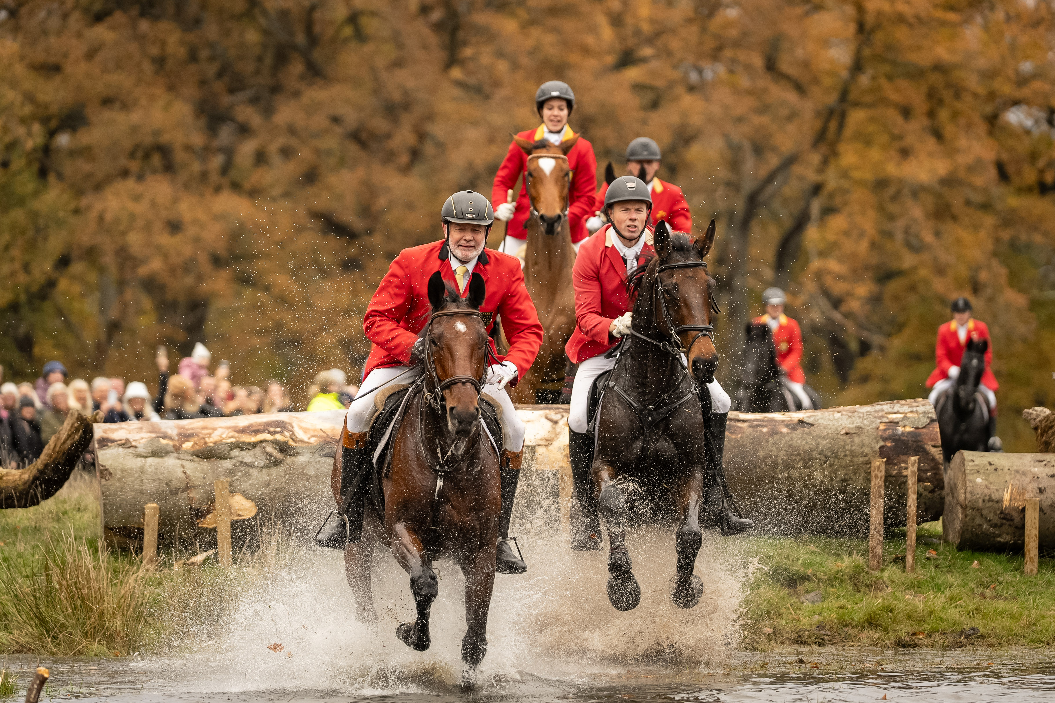 Participants compete in the Hubertus Hunt at Eremitage Castle in Dyrehaven near Klampenborg, Denmark, on November 3, 2024. The Hubertus Hunt is a continuation of the old parforce hunts for which Dyrehaven was originally established. Here, dogs were used to track the fox, and the field followed the dogs and the fox. Today, there are no hunting dogs, and the fox is replaced by two experienced riders who ride at the front with fox tails on their red riding jackets. About 100 riders participate in the traditional hunt. (Photo by Emil Nicolai Helms/Ritzau Scanpix via AFP Photo)