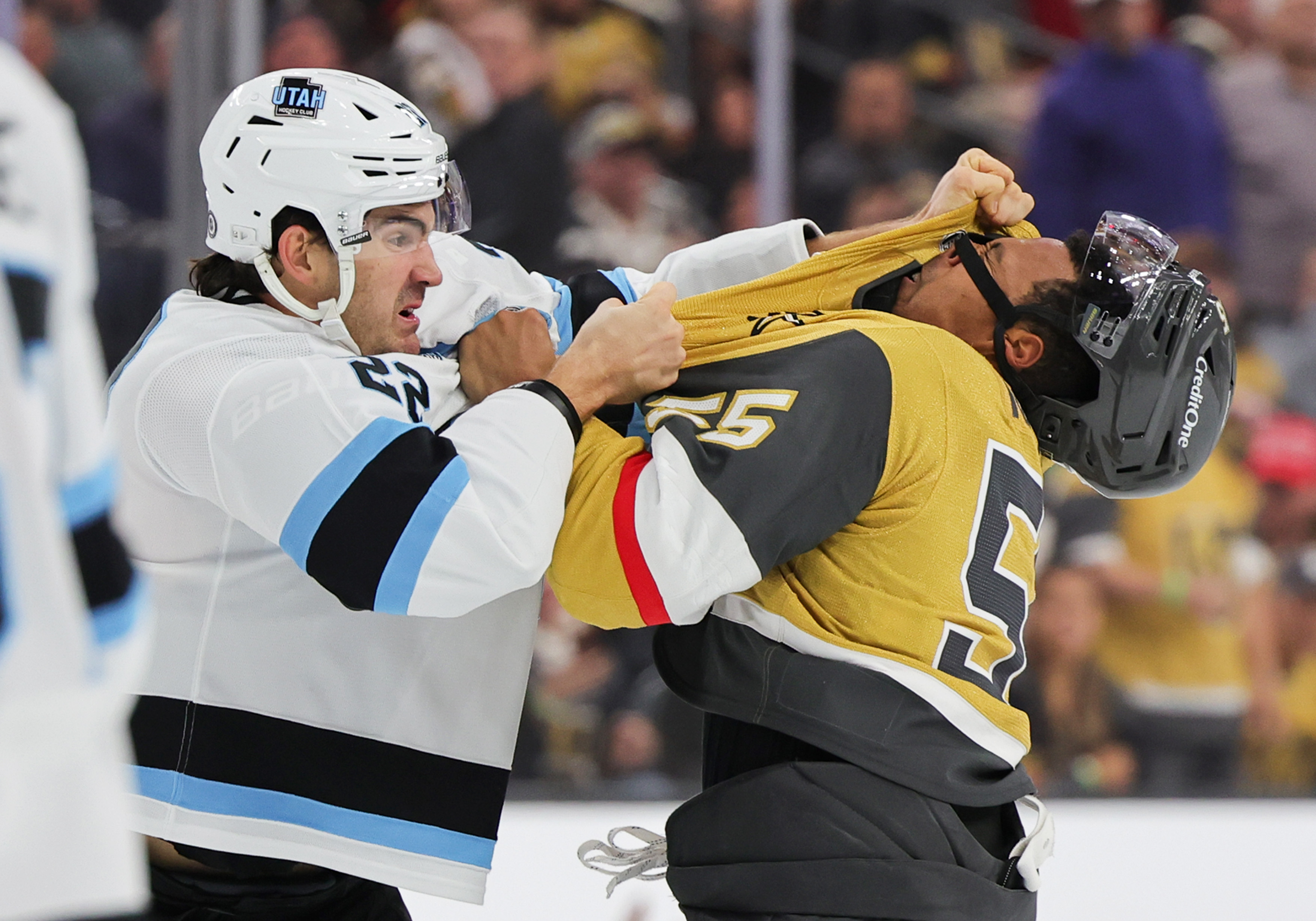 Jack McBain #22 of the Utah Hockey Club and Keegan Kolesar #55 of the Vegas Golden Knights fight in the first period of their game at T-Mobile Arena on November 02, 2024 in Las Vegas, Nevada. (Photo by Ethan Miller/Getty Images)