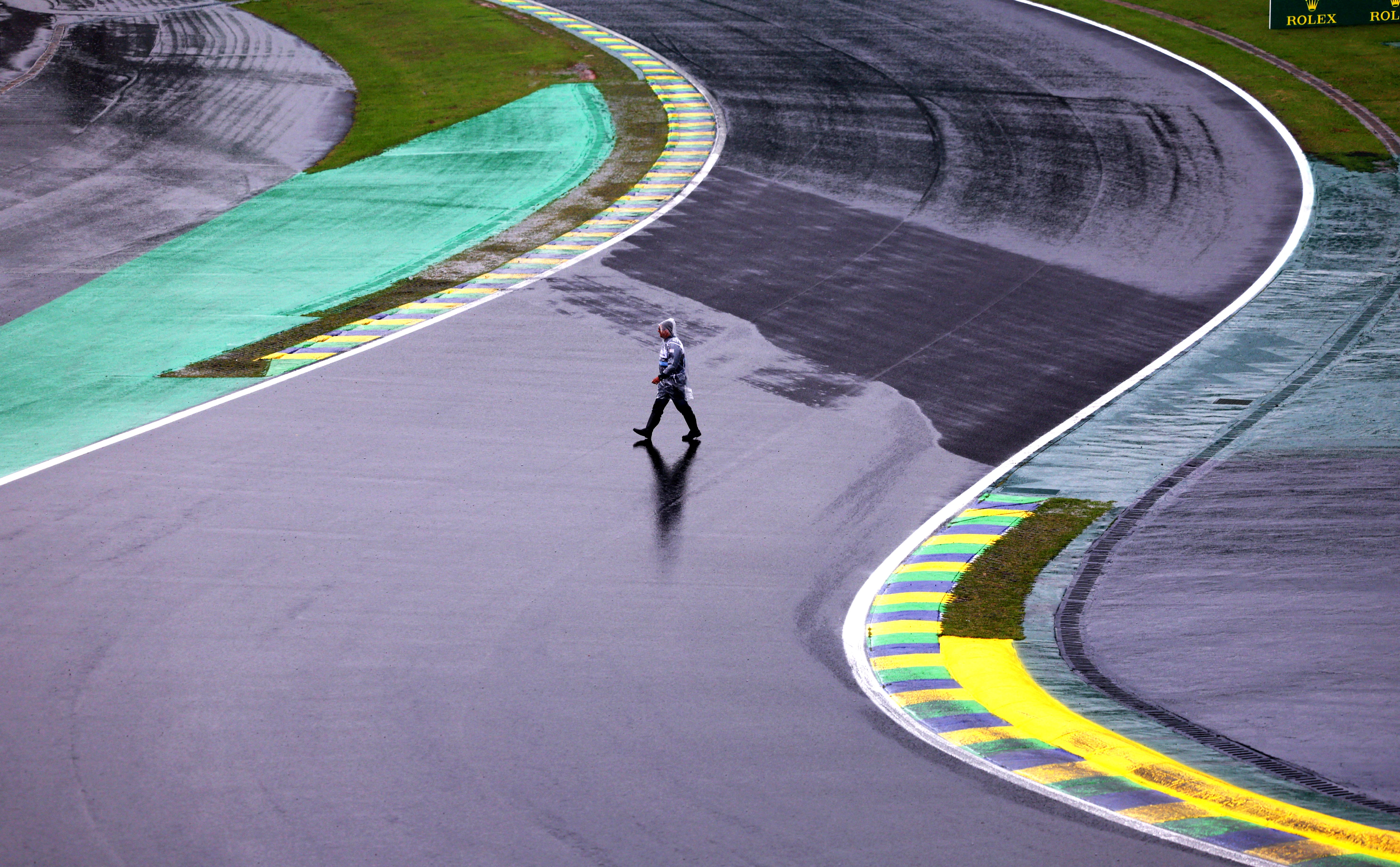 A man walks on the track as qualifying Formula One F1 is postponed due to bad weather at Autodromo Jose Carlos Pace in Sao Paulo, Brazil on November 2, 2024. (Photo by Amanda Perobelli/Reuters)