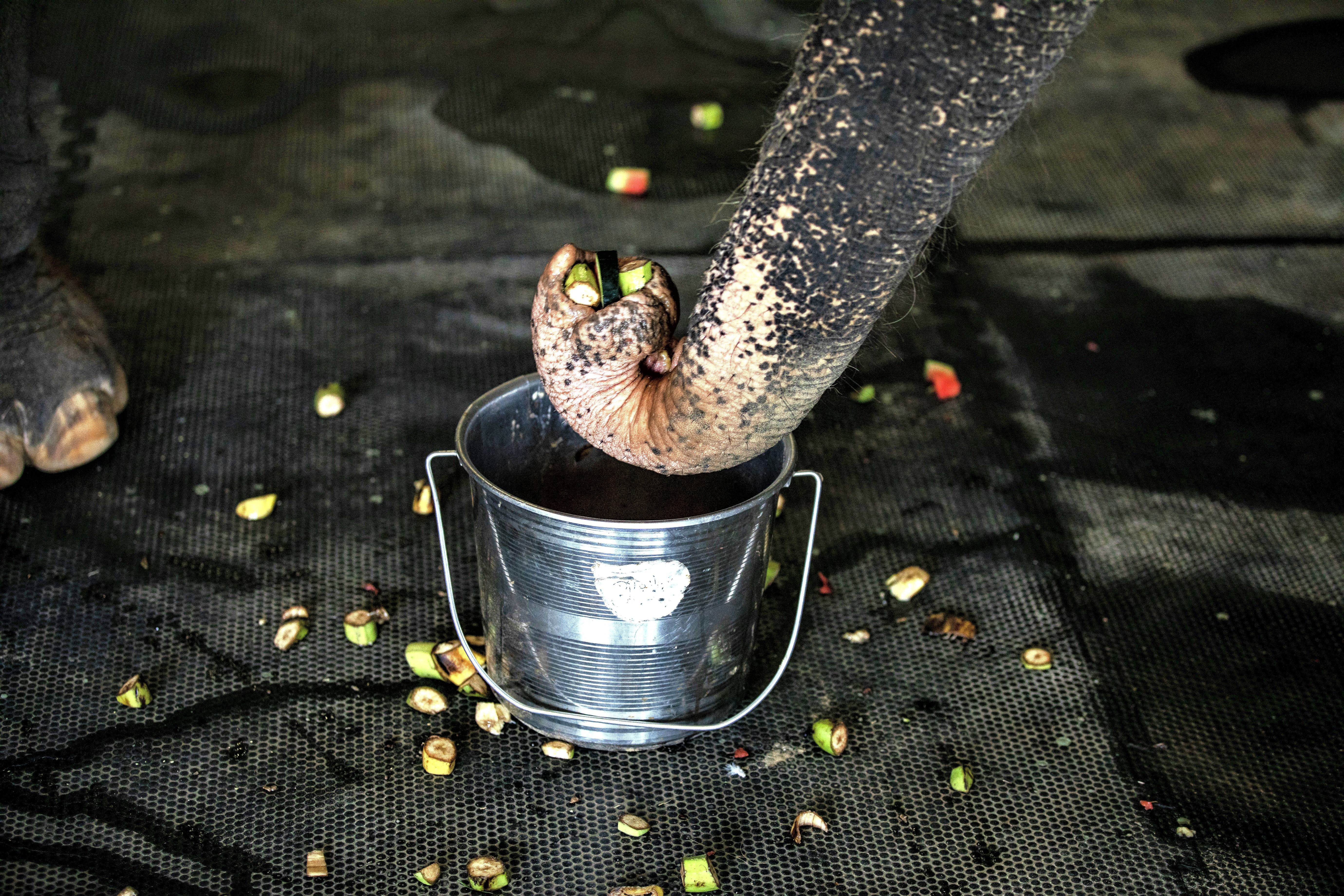 Ginger (61), a rescued blind female Asian elephant, feeds from her bucket of fruits while waiting for her medical treatment, at Wildlife SOS's Elephant Conservation and Care Centre (ECCC), ahead of “World Elephant Day”, near Mathura in Uttar Pradesh, India on August 10, 2023. World Elephant Day is observed annually on August 12 to promote awareness and conservation of elephants all over the world. (Photo by Amarjeet Kumar Singh/Anadolu Agency via Getty Images)