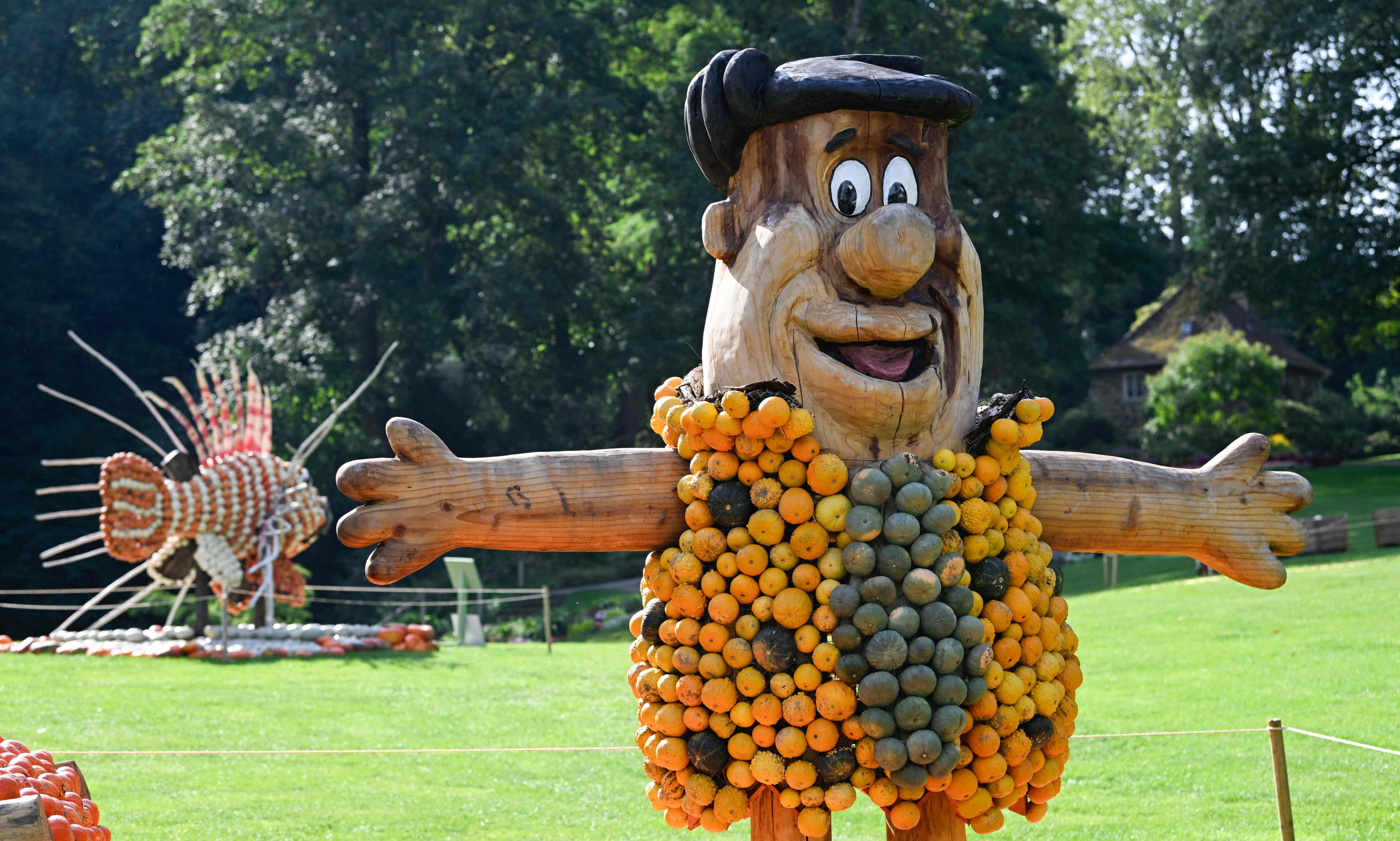A character depicting Fred Flintstone is seen at a pumpkin exhibition in the garden of Ludwigsburg Castle in Ludwigsburg, southern Germany, on August 24, 2023. (Photo by Thomas Kienzle/AFP Photo)