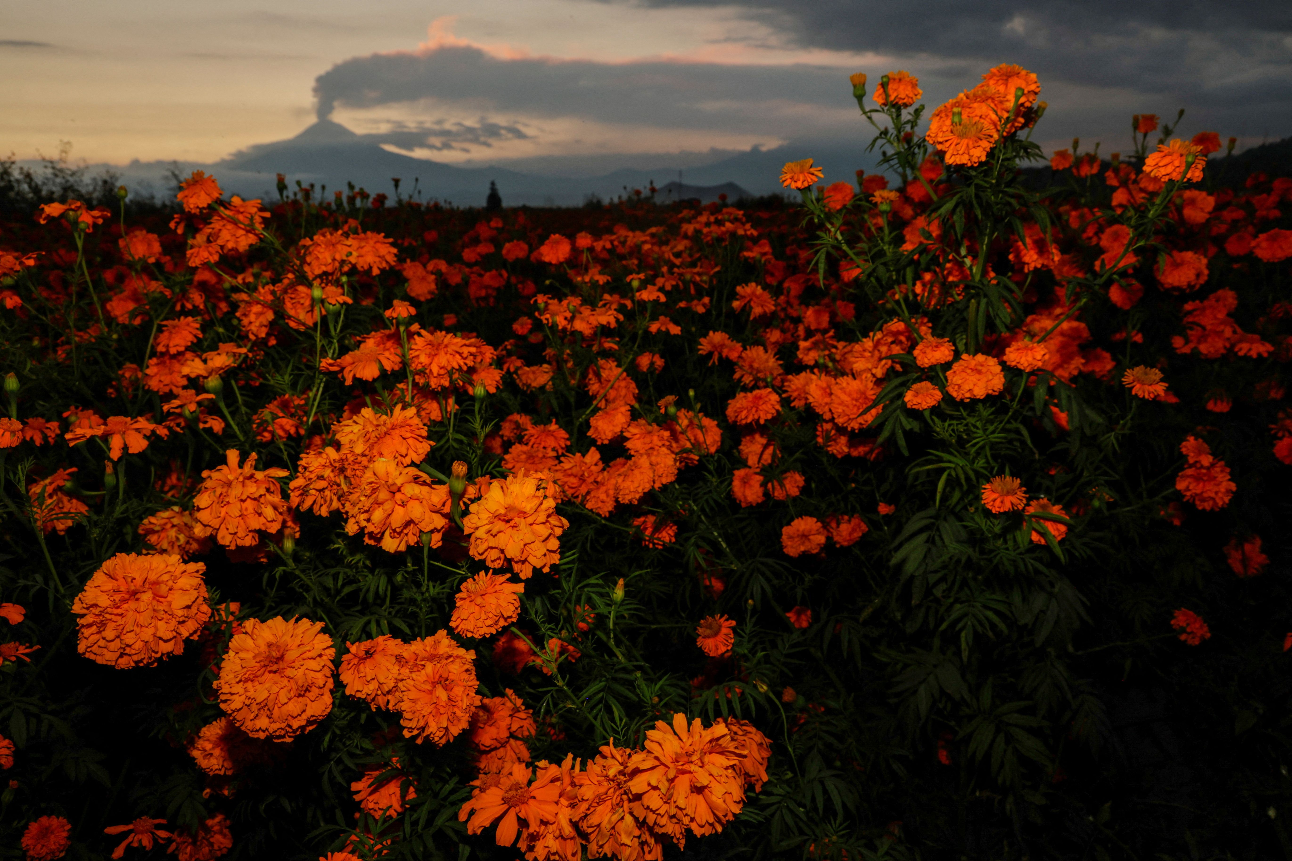 Cempasuchil (Marigold) flowers are pictured while the Popocatepetl volcano spews a column of ash and smoke in the background as seen from San Pedro Cholula, Puebla state, Mexico on October 23, 2024. (Photo by Imelda Medina/Reuters)