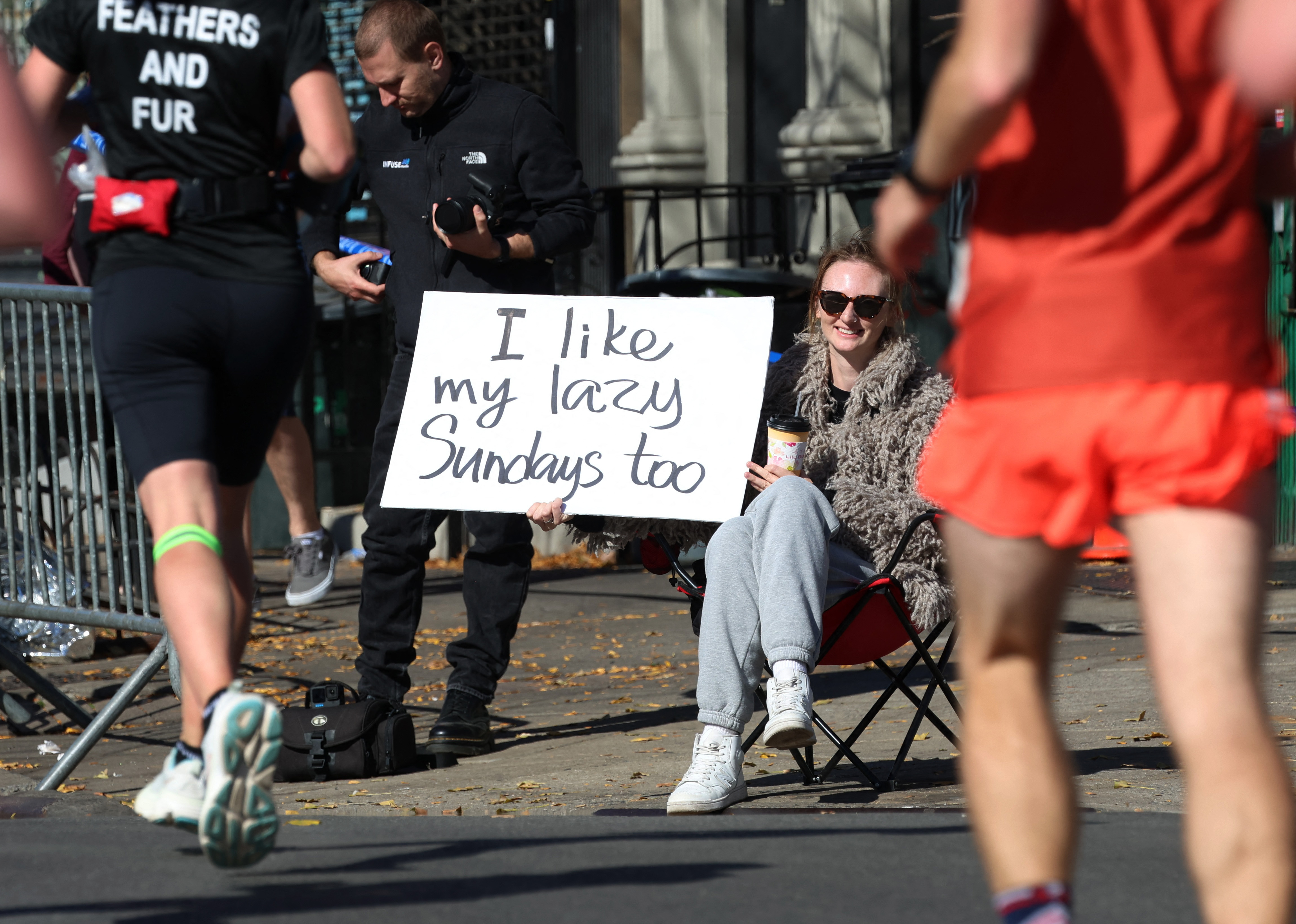 A spectator displays a banner reading “I like my lazy Sundays too” during the marathon in New York on November 3, 2024. (Photo by Brendan Mcdermid/Reuters)