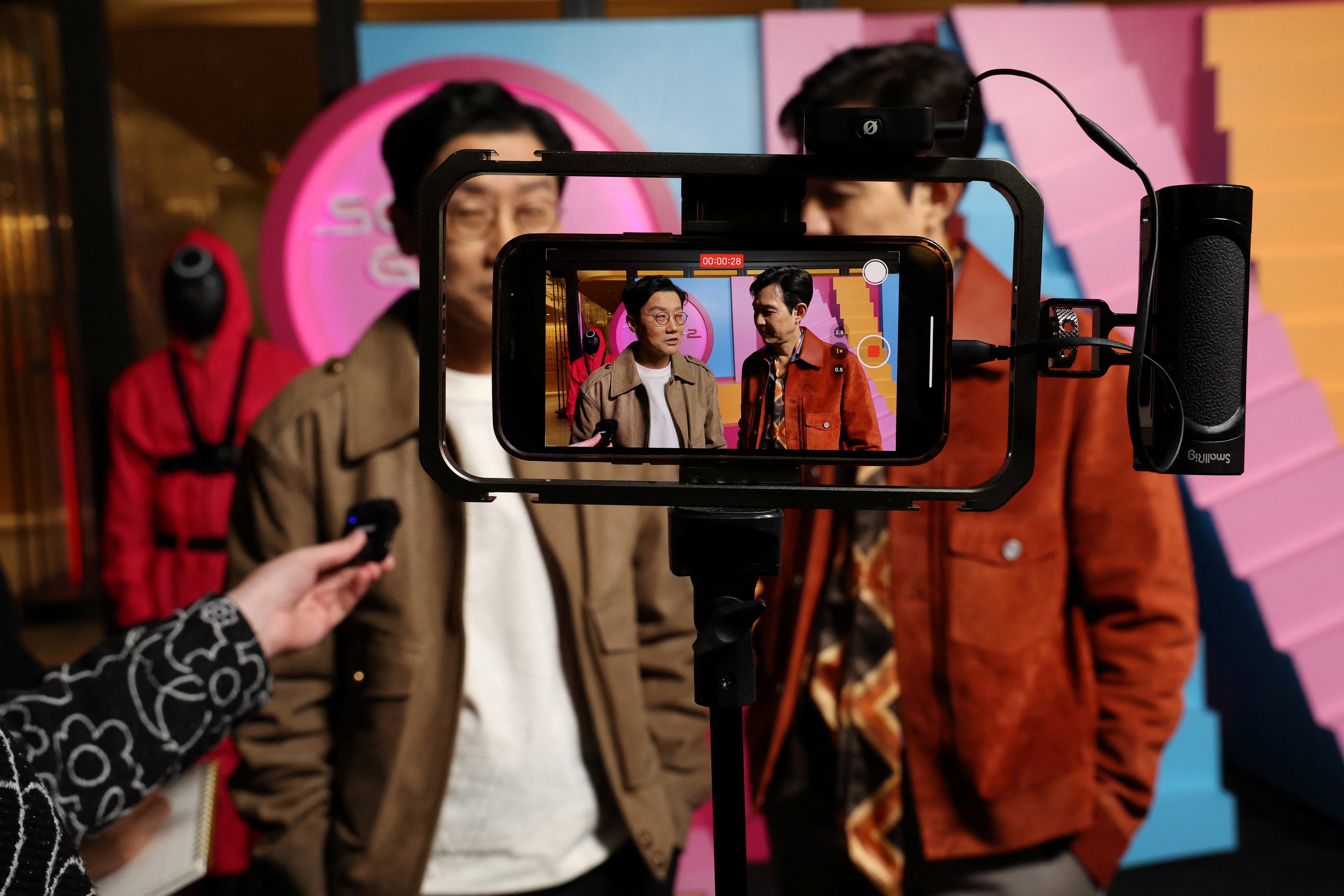 Series creator and director Hwang Dong-hyuk and cast member Lee Jung-jae talk to media at a special event for season 2 of the television series Squid Game in Los Angeles, California, U.S., November 3, 2024. (Photo by Mario Anzuoni/Reuters)