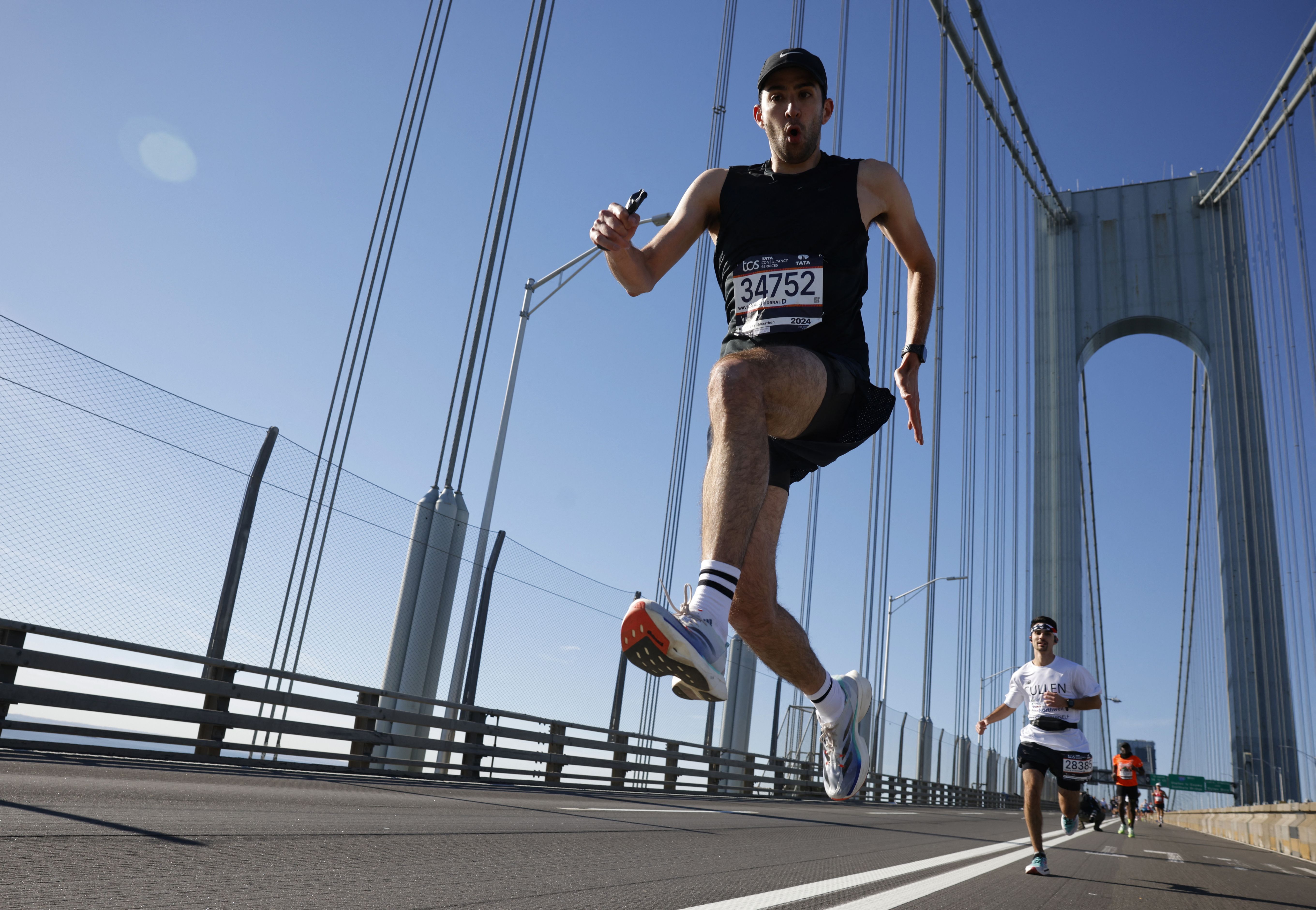 Alexander Levine crosses the Verrazzano-Narrows Bridge during the marathon in New York on November 3, 2024. (Photo by Brendan Mcdermid/Reuters)