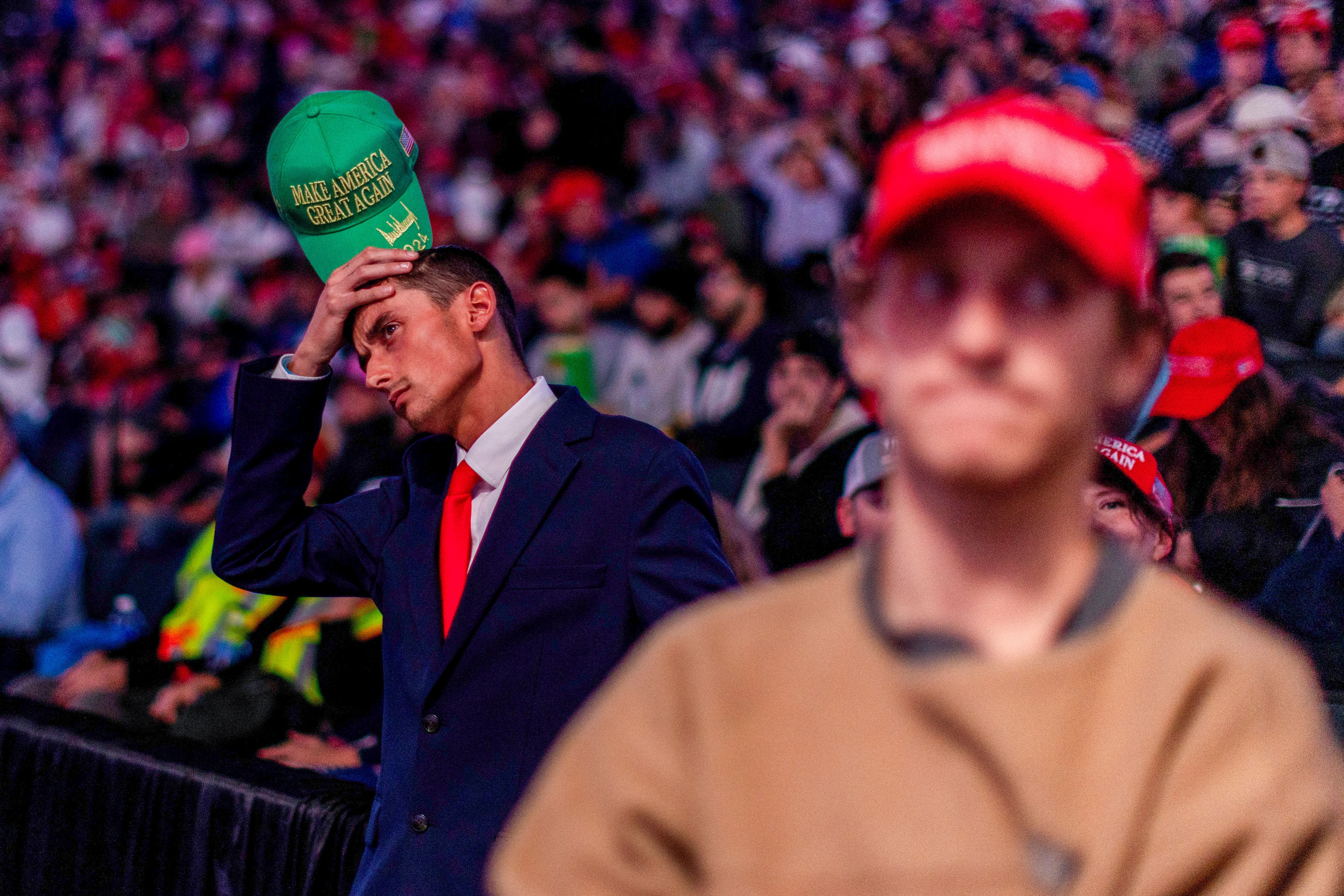 People wait inside the venue where Donald Trump is expected to hold a campaign rally in Grand Rapids, Michigan on November 4, 2024. (Photo by Carlos Osorio/Reuters)