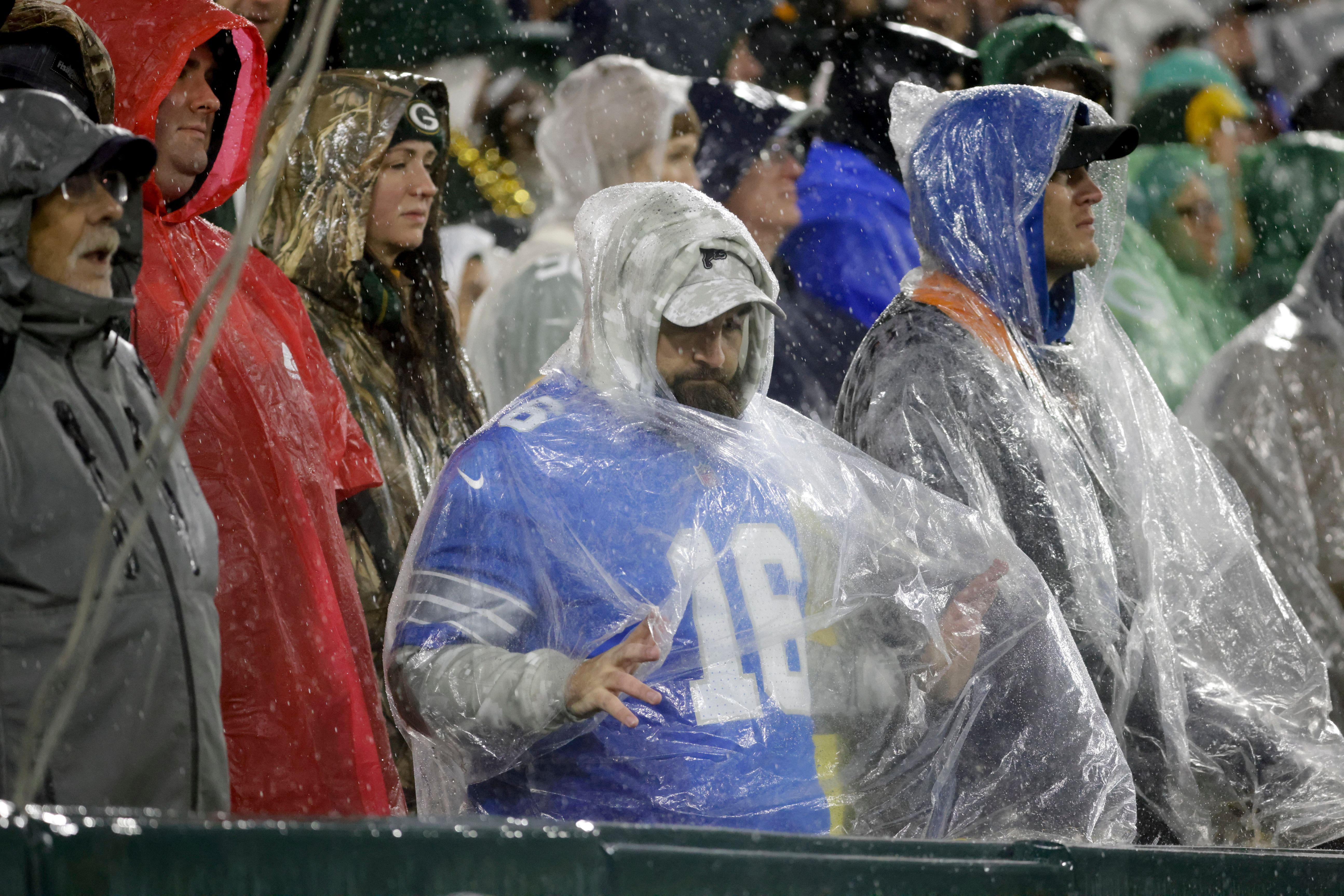 Rain comes down on fans during the second half of an NFL football game between the Green Bay Packers and the Detroit Lions, Sunday, November 3, 2024, in Green Bay, Wis. (Photo by Mike Roemer/AP Photo)