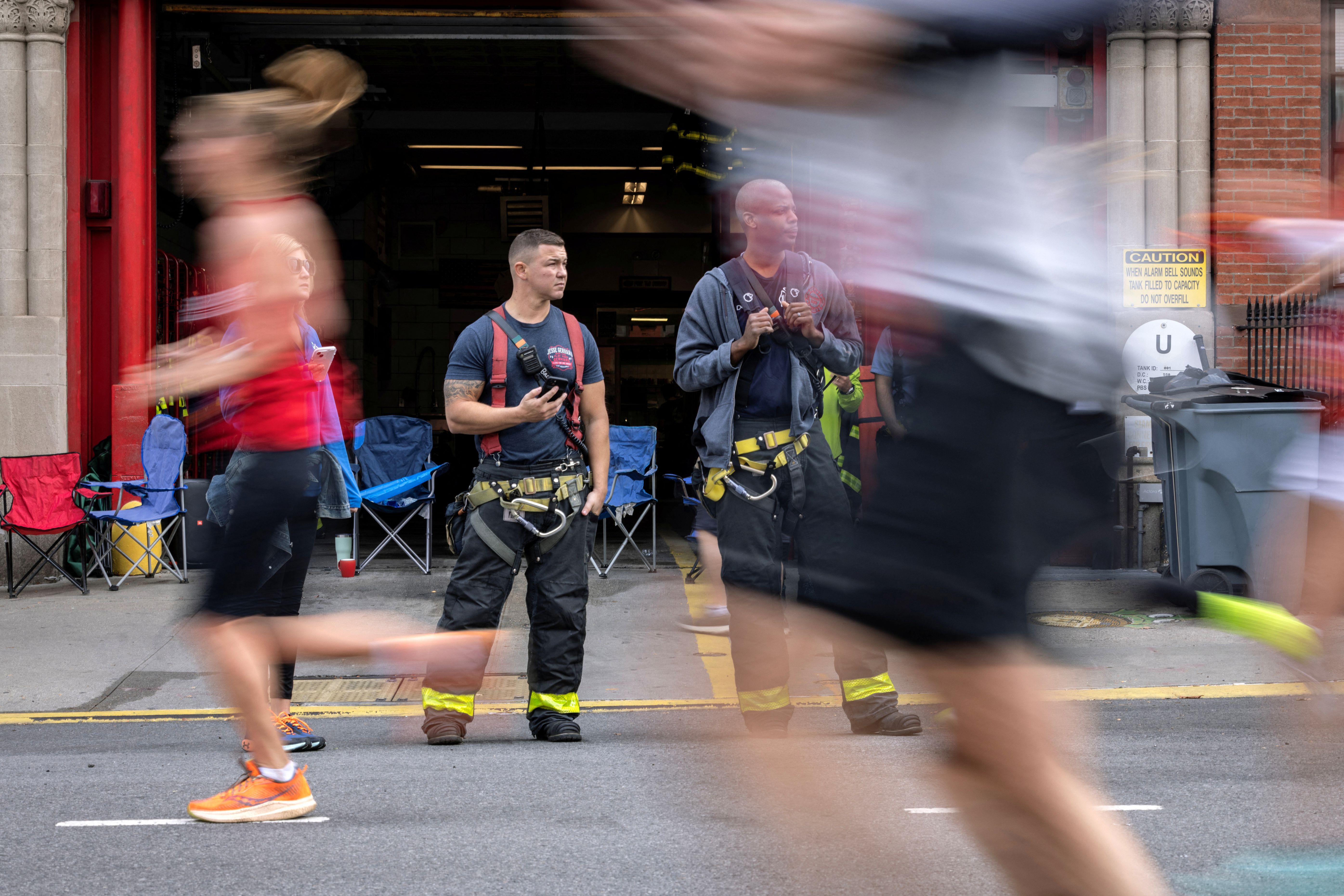 Firefighters from the New York Fire Department watch as runners make their way through the Brooklyn borough in New York on November 3, 2024. (Photo by Maye-E Wong/Reuters)