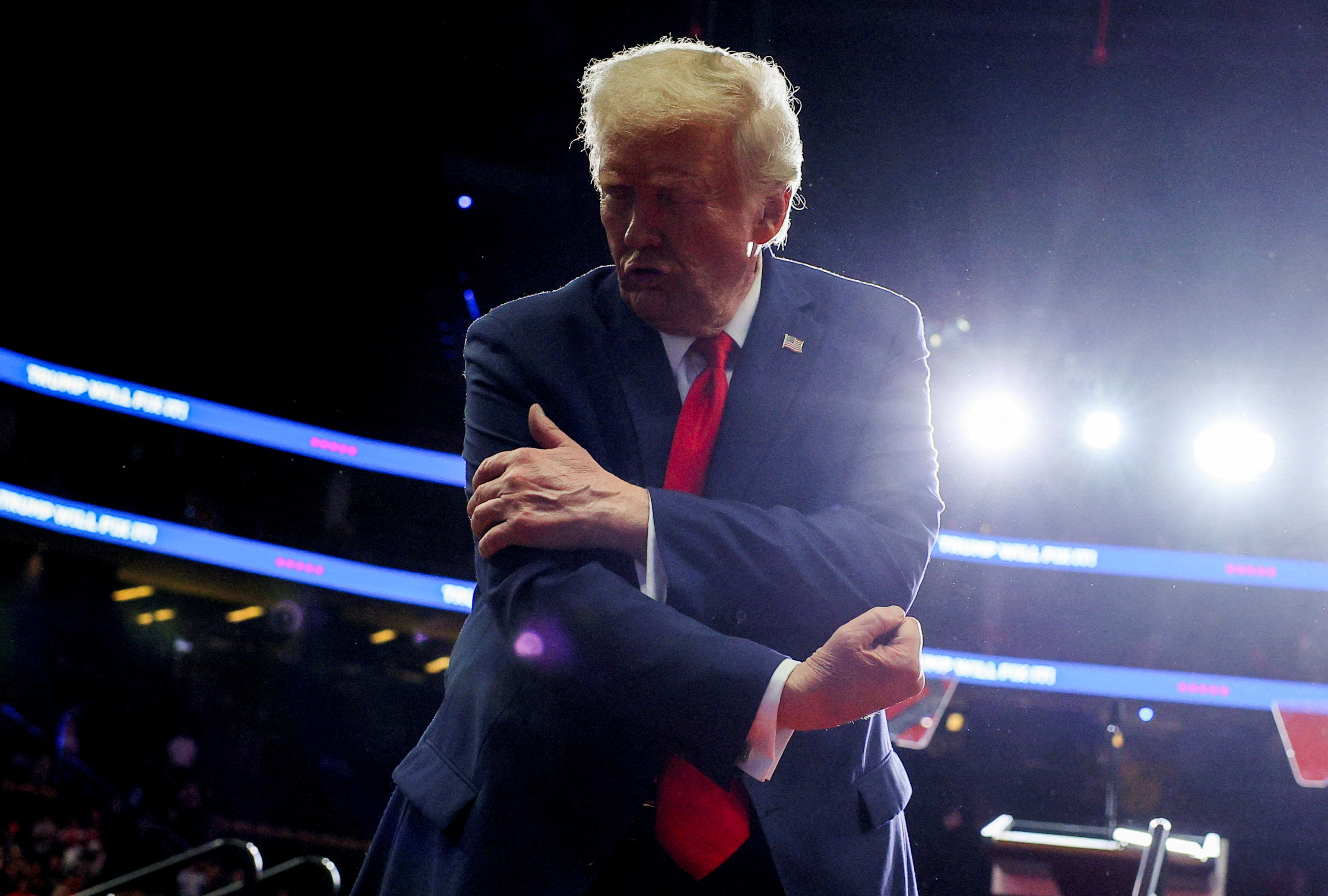 Donald Trump flexes his muscles during a campaign rally at PPG Paints Arena in Pittsburgh, Pennsylvania on November 4, 2024. (Photo by Brian Snyder/Reuters)